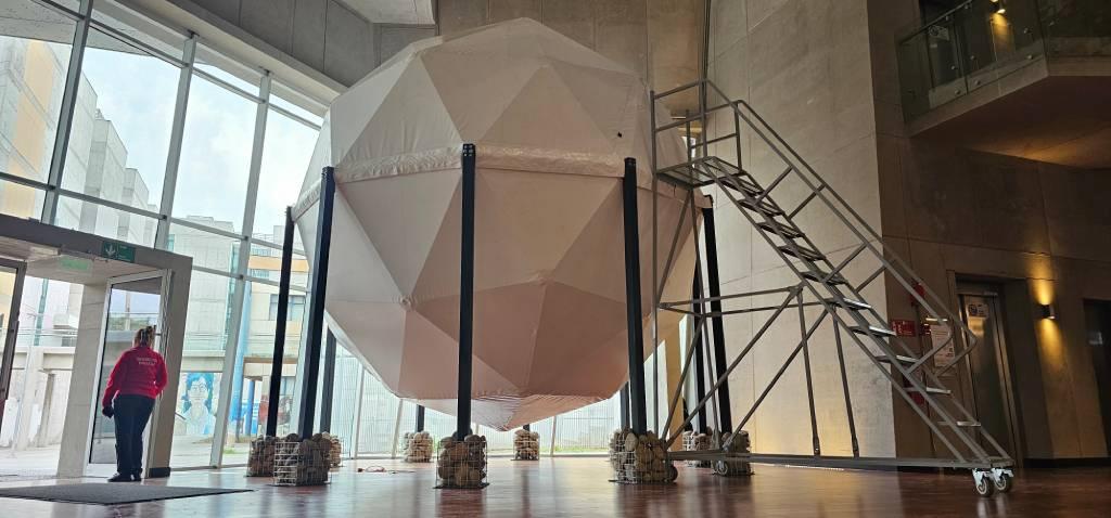 También, Balbontín especificó las características técnicas de la obra que, hasta el 30 de diciembre, habitará en el Hall de la Plataforma Cultural del Campus Juan Gómez Millas otorgando a sus visitantes una experiencia que combina arquitectura, sonido y escucha. Así, la artista explicó que la muestra cuenta con una configuración multicanal 16.1 (16 parlantes y un subwoofer: 5 superiores, 5 en el ecuador, 5 inferiores y un parlante omnidireccional central) combinando, “dos naturalezas diferentes de experimentación sonoro espacial: por un lado la acústica y por otro la espacialización sonora”, detalló.