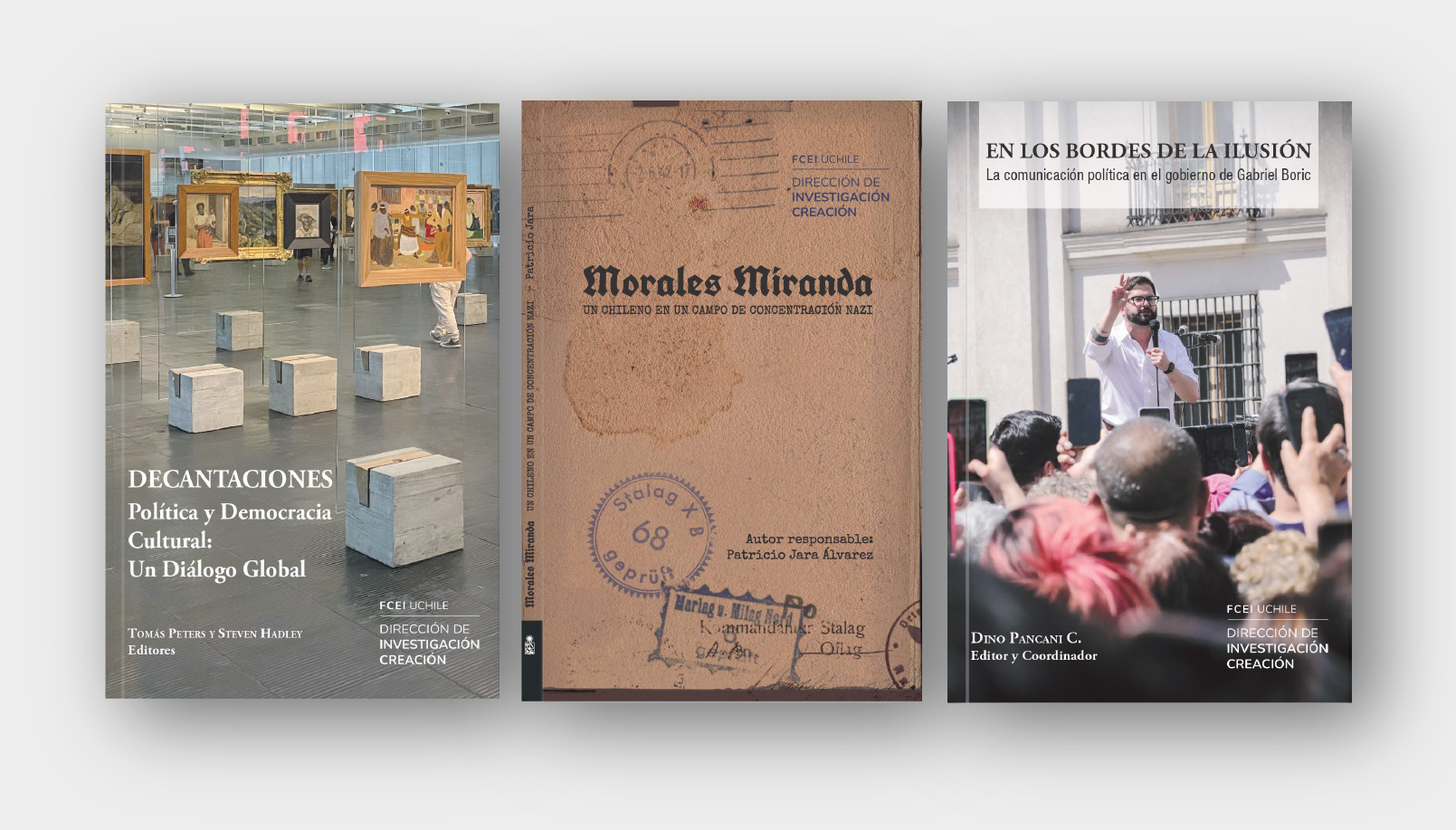 Los académicos de la Facultad de Comunicación e Imagen (FCEI) de la Universidad de Chile, Dino Pancani, Tomas Peters y Patricio Jara publicarán libros que estarán disponibles de forma gratuita gracias al trabajo conjunto con la Dirección de Investigación Creación (INCREA), iniciativa que busca reafirmar el compromiso de la Universidad con la divulgación del conocimiento. Así lo afirma Carlos Ossa, director: "La Dirección de Investigación Creación impulsa esta iniciativa de apoyo a la publicación de libros como una estrategia para abrir y democratizar el acceso del saber producido por nuestra Facultad para la sociedad"
