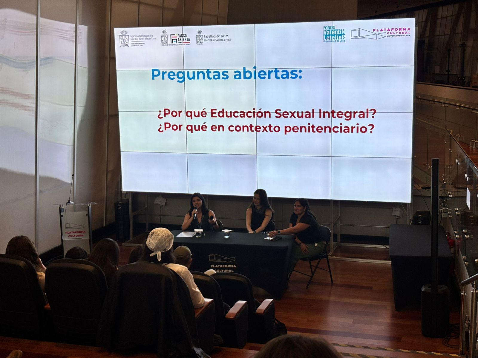 El encuentro que tuvo lugar en la Plataforma Cultural del campus Juan Gomez Millas de la Universidad de Chile tuvo como propósito presentar los resultados de la primera etapa del proyecto “Educación Integral de la Sexualidad para Mujeres Privadas de Libertad”, una iniciativa financiada por el Fondo Valentín Letelier y que se ha desarrollado en los Centros Penitenciarios Femeninos de San Miguel y de Santiago.