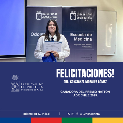 Con el trabajo "Evaluation of a mobile health application enhancing oral health knowlege in older adults: quasi experimental study", la Dra. Constanza Morales Gómez, estudiante del Programa de Doctorado en Ciencias Odontológicas de la Facultad de Odontología de la Universidad de Chile (FOUCh), logró el Premio HATTON de la International Association of Dental Reserch, IADR-Chile, y representará a nuestro país en San Diego USA 2026.