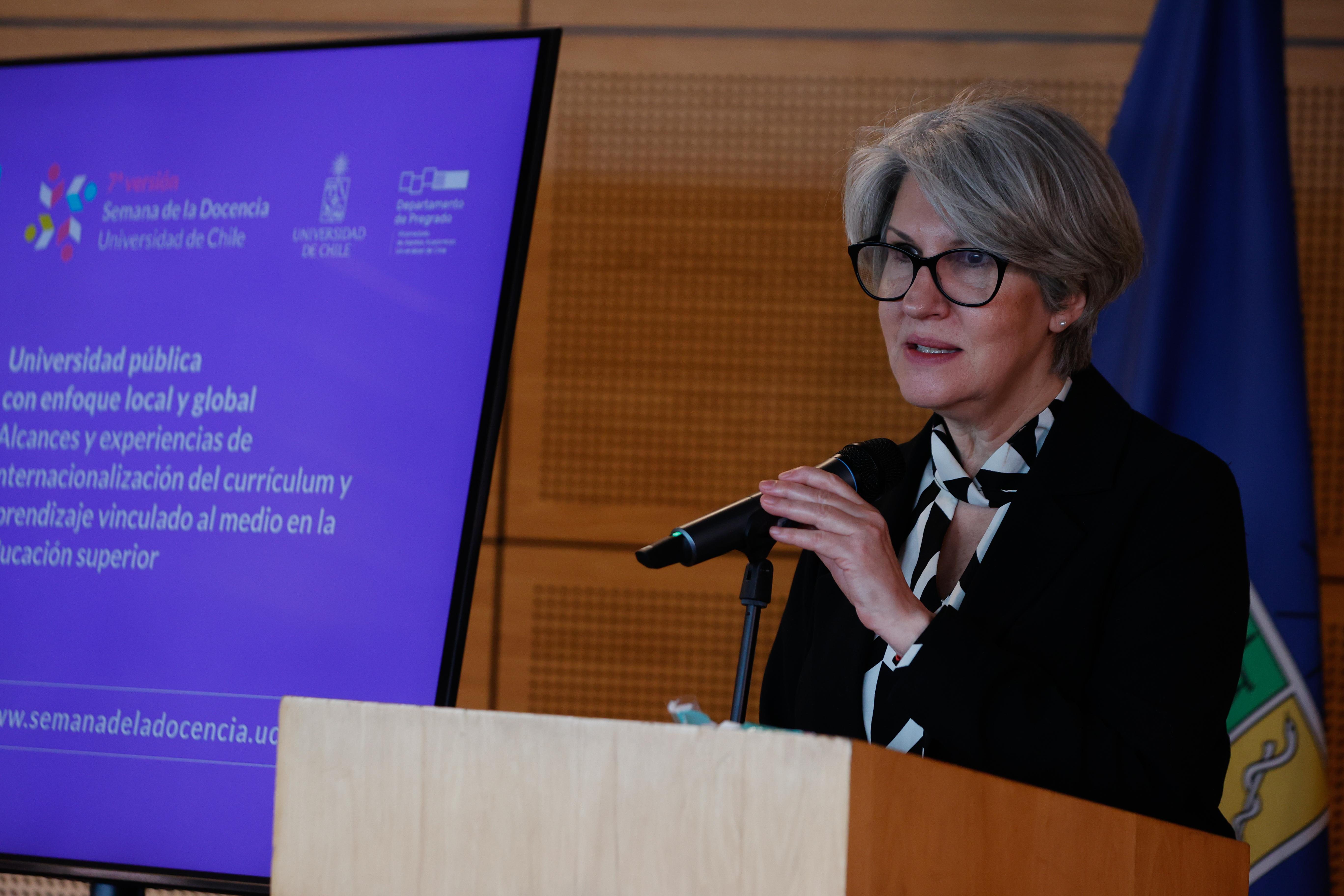 Con palabras de bienvenida de Pilar Barba, vicerrectora de Extensión y Comunicaciones de la Universidad de Chile, se dio inicio al segundo día de la Semana de la Docencia, que este año lleva por título Universidad pública con enfoque local y global. Alcances y experiencias de internacionalización del currículum y aprendizaje vinculado al medio en la educación superior, instancia impulsada por el Departamento de Pregrado de la Vicerrectoría de Asuntos Académicos en colaboración con la Vicerrectoría de Extensión y Comunicaciones de la Universidad de Chile.