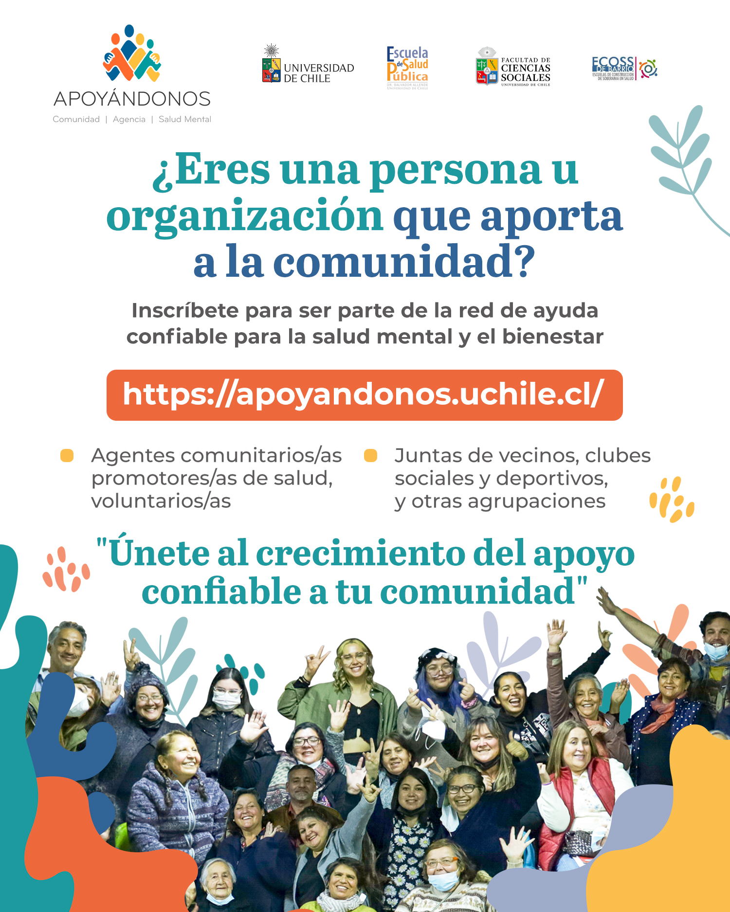 La Iniciativa Apoyándonos reúne a la Universidad de Chile, los Servicios de Salud, departamentos de salud municipales, la red de Centros de Salud Familiar, universidades estatales del país y organizaciones sociales, con el fin de crear un sistema colaborativo que promueva el cuidado colectivo de la salud mental. Su modelo, formativo integra saberes académicos, profesionales y comunitarios, con fuerte arraigo territorial y participación de estudiantes universitarios como tutores.