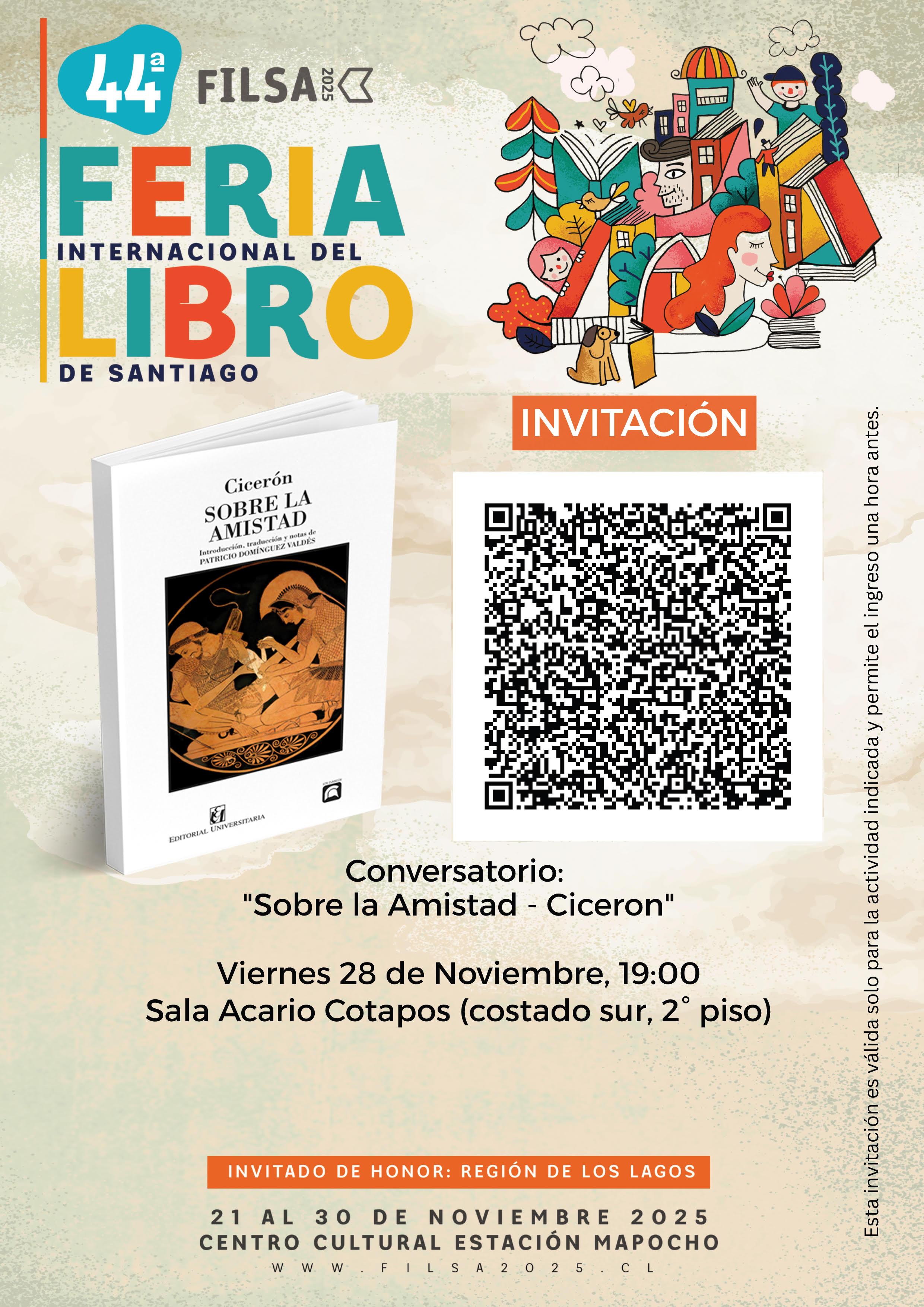 En el marco de la 44ª Feria Internacional del Libro de Santiago (FILSA), Editorial Universitaria realizará un conversatorio en torno a una nueva edición comentada del clásico Sobre la amistad, de Marco Tulio Cicerón, uno de los textos fundamentales de la filosofía antigua y un referente para la reflexión ética y política. La obra, traducida, introducida y anotada por el académico Patricio Domínguez Valdés, forma parte de la colección Los Clásicos de la editorial.