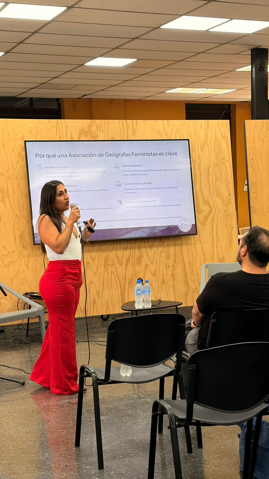 La geógrafa expuso el trabajo colectivo que han desarrollado durante los últimos seis años en la organización, una red que reúne a más de 200 socias distribuidas en todo el país. “Nos movió la necesidad de posicionar la profesión desde una perspectiva feminista, visibilizando problemáticas geográficas y aportando a la toma de decisiones”, explicó.
