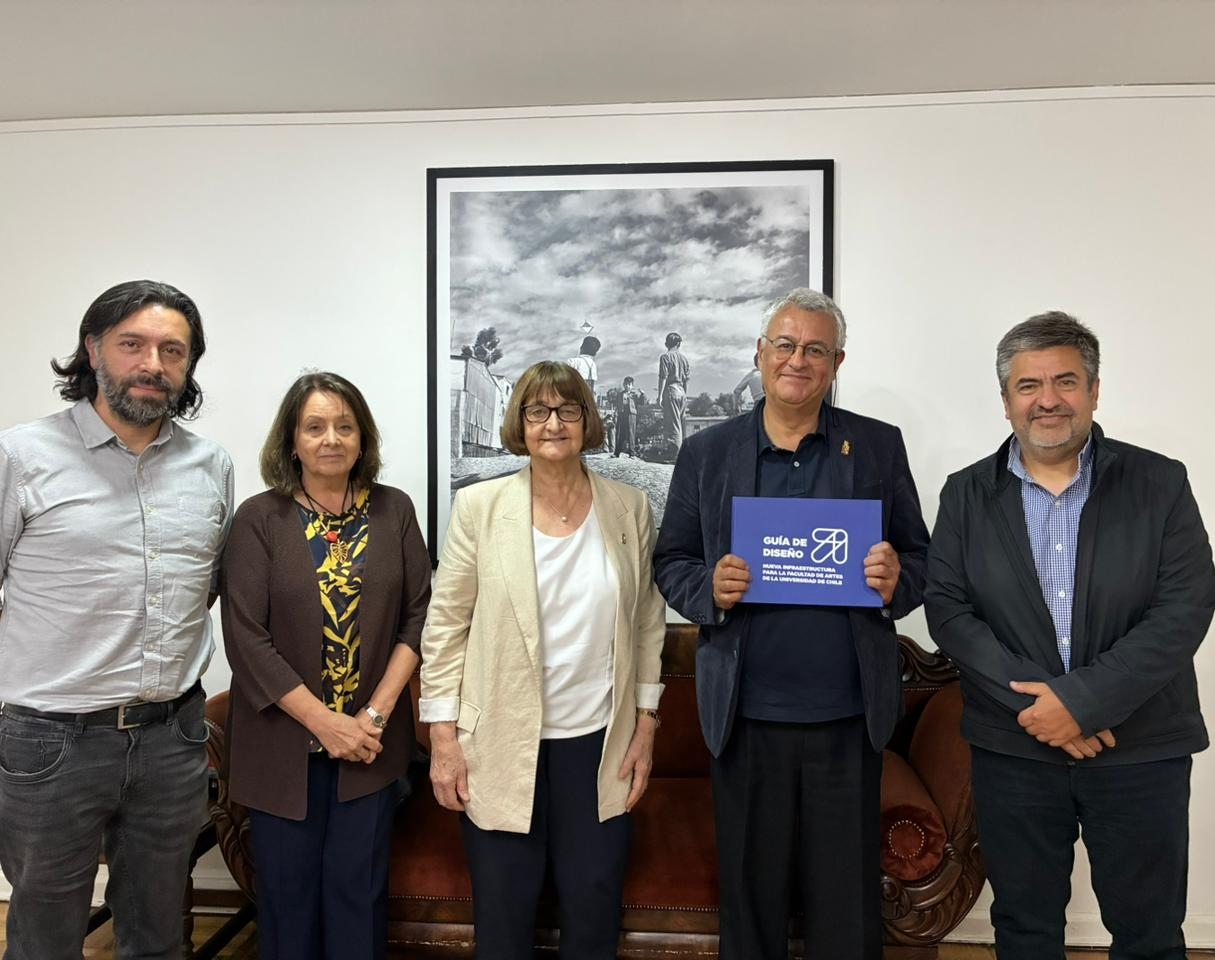 Ante la imposibilidad de asistir a la ceremonia del miércoles, la rectora de la Universidad de Chile, Rosa Devés Alessandri, se reunió el lunes de esta semana con el decano y el vicedecano de la Facultad para conversar sobre el Proyecto Nueva Infraestructura, y recibir en sus propias manos una copia de la Guía de Diseño.