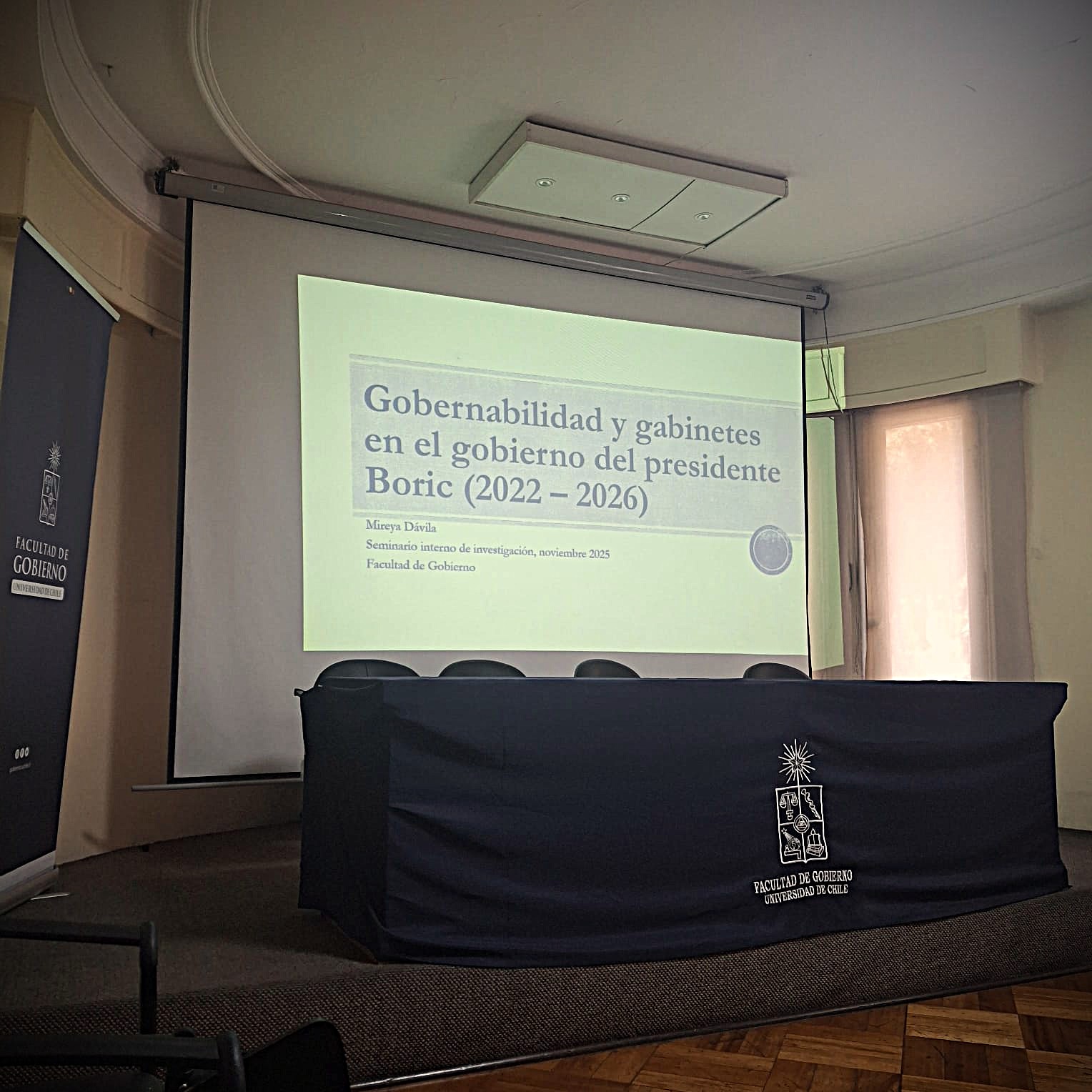 En un reciente seminario interno de investigación, la comunidad académica de la Facultad de Gobierno se adentró en las dinámicas del poder ejecutivo chileno. El pasado 11 de noviembre, la Dra. Mireya Dávila, profesora asistente del Departamento de Administración y Gestión Pública, presentó los avances de su investigación: "Gobernando con dos coaliciones: los gabinetes del presidente Gabriel Boric en Chile (2022 – 2026)".