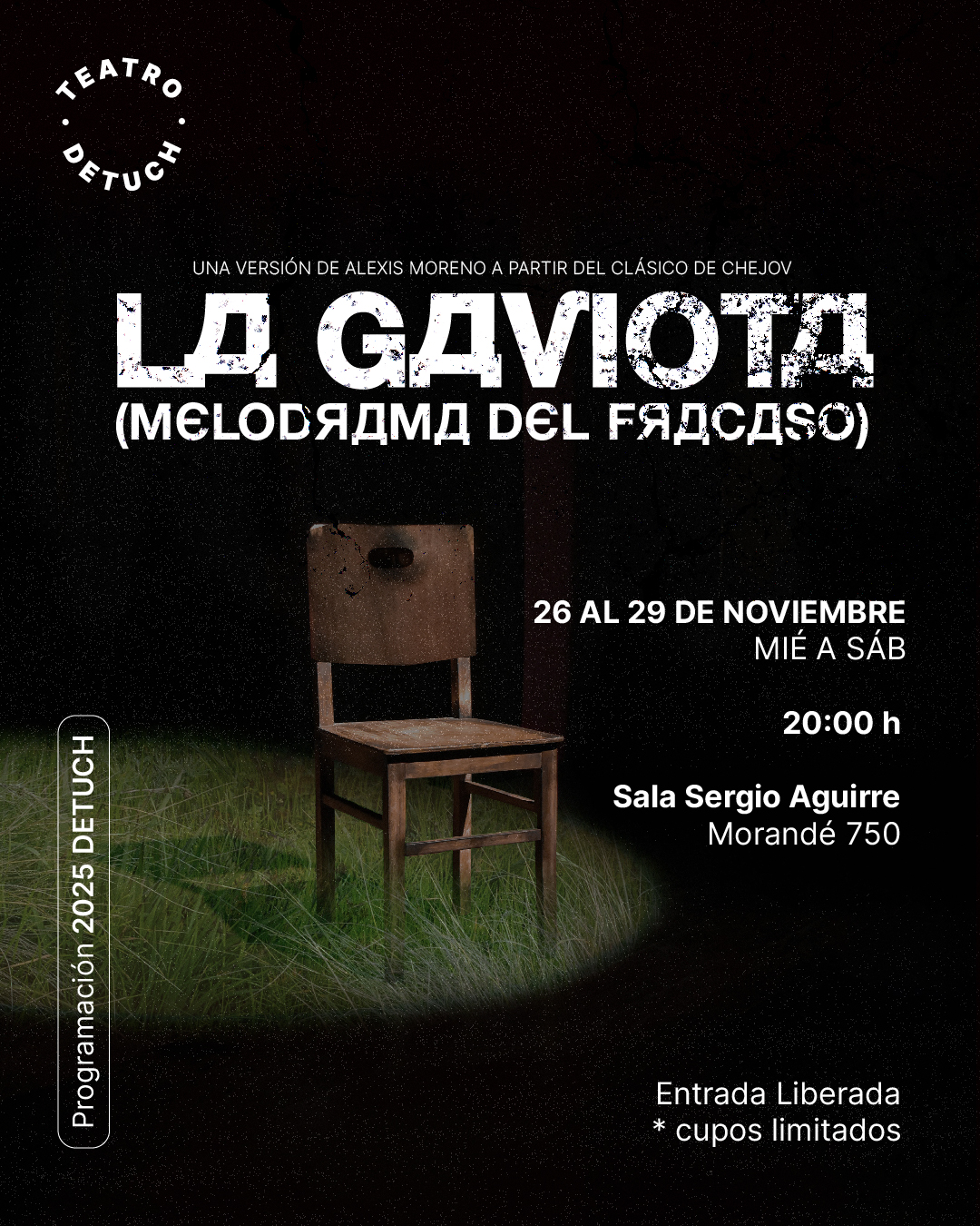 En el marco de la Temporada 2025 del Departamento de Teatro de la Facultad de Artes de la Universidad de Chile, este 27, 28 y 29 de noviembre a las 20hrs en la Sala Sergio Aguirre se presentará la obra La Gaviota (Melodrama Del Fracaso), una versión de Alexis Moreno a partir del clásico de Chejov, protagonizada por estudiantes de II año de Actuación Teatral y Diseño Teatral, con la guía de Diseño Escénico de Andrea Contreras.