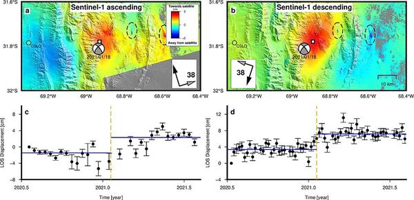 El punto de partida de este estudio fue el sismo cortical Mw 6.4 ocurrido el 18 de enero de 2021 en la ciudad de San Juan, en la zona central andina de Argentina. Se trató de un evento poco frecuente y de gran magnitud, con una ruptura sísmica de profundidad menor que 20 km, que dejó una huella de deformación superficial detectable desde el espacio.
