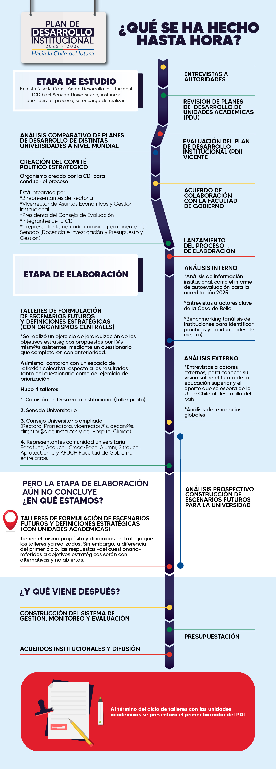 El Plan de Desarrollo Institucional de la Universidad de Chile 2026-2036 será la carta de navegación que orientará el cumplimiento de sus desafíos institucionales durante el próximo decenio. Su elaboración está a cargo del Senado Universitario, tal como lo establece el Estatuto de la Universidad de Chile, en tanto órgano superior encargado de establecer las políticas y estrategias de desarrollo institucional. A continuación, te informamos en qué etapa del proceso de elaboración se encuentra el documento y qué acciones ya se han realizado.