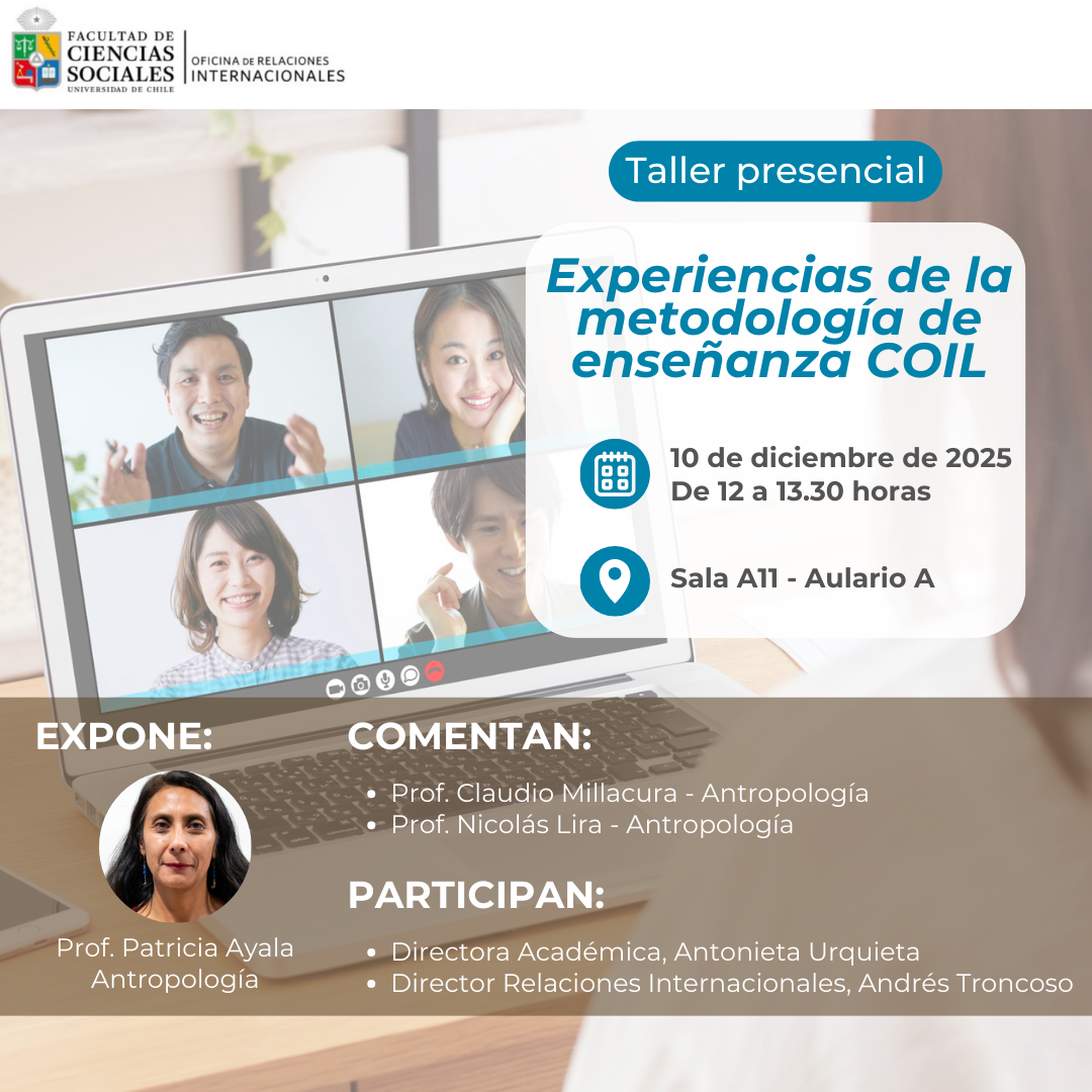 El encuentro tuvo como principal exponente a la profesora Patricia Ayala Rocabado del departamento de Antropología de la Universidad de Chile, quien compartió su experiencia como docente COIL una asignatura troncal de la carrera de Antropología. Así, durante el segundo semestre 2025 y en conjunto con la profesora Francesca Fernandini Parodi del departamento de Arqueología de la Pontificia Universidad Católica del Perú (PUCP), los estudiantes UCHILE del curso de Teoría Antropológica IV a través de módulos combinados estudiaron con estudiantes PUCP del curso de Debate Contemporánea de Teoría Antropológica.