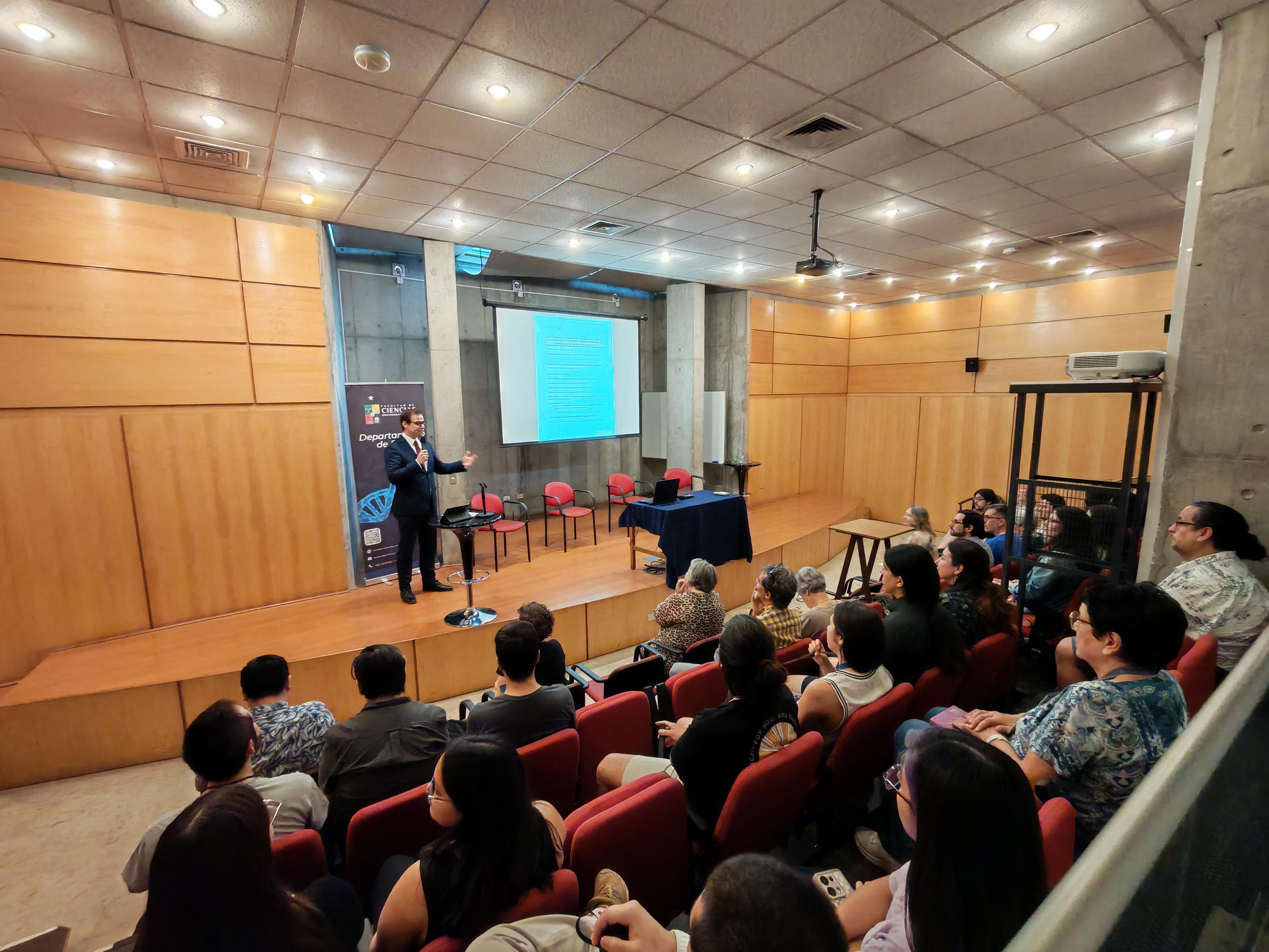 Este encuentro dio inicio con unas palabras del Vicedecano de la Facultad, Dr. Robert Auffarth, quien destacó los orígenes y el impacto del Departamento de Biología en el desarrollo científico nacional. “El Departamento de Biología ha tenido muchos logros a lo largo de los años, muchos premios nacionales han salido de aquí. De hecho, en esta Facultad se creó el primer doctorado en ciencias del país y la primera graduada fue Cecilia Hidalgo, quien posteriormente fue galardonada como Premio Nacional de Ciencias Naturales en 2006”.