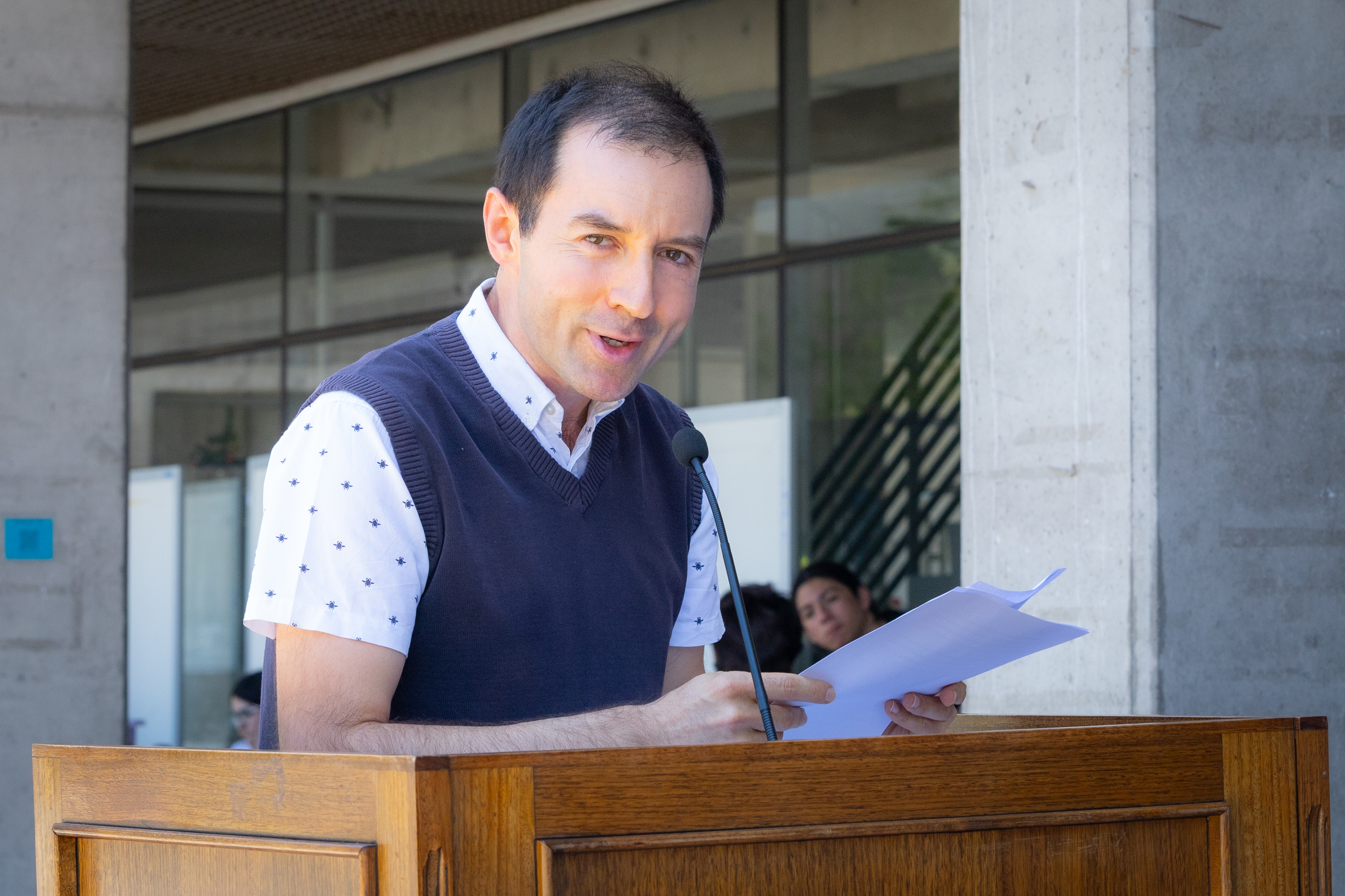 El decano Pablo Richter se acercó al podio y se dirigió a las y los asistentes con un discurso cargado de emoción, en el que evocó la memoria y el legado de Ghigliotto, permitiendo que sus descendientes escucharan, a través de sus palabras, el reconocimiento a su historia y trascendencia.
