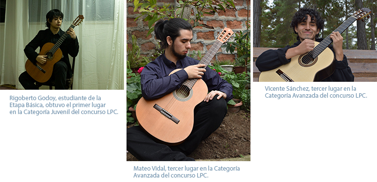 Los estudiantes del académico Luis Orlandini: Rigoberto Godoy, Vicente Sánchez y Mateo Vidal, y los alumnos del profesor Romilio Orellana: Tomás Romero y Pablo Melo fueron reconocidos este año en la XII versión del concurso Liliana Pérez Corey (LPC), realizado entre el 22 y 25 de octubre en Chillán, en la región de Ñuble. Este premio fue creado y actualmente es organizado por Eugenia Rodríguez, egresada de la Facultad de Artes de la U. de Chile, junto a la guitarrista Isabel Almeida, con la finalidad de honrar el trabajo de la gran guitarrista Liliana Pérez Corey.