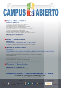 Las actividades enmarcadas en la iniciativa "Campus Abierto", que se realizarán en el Campus Juan Gómez Millas, tienen como objetivo generar y potenciar un espacio integrado de extensión cultural y académica. Éstas comienzan el viernes 12 de noviembre a las 12:00 hrs. con una Muestra Artística, en la cual se presentarán conjuntos de danza y música de la Facultad de Artes.