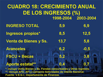 El presupuesto universitario ha crecido, desde el punto de vista de ingresos de MM$117.206 en 2003 a un proyectado de MM$189.516 en 2004 [Cuadro 17]. Este incremento real de 6.9% se descompone de la siguiente manera: 12.5% por ingresos propios; 5.8% por venta de servicios; -0.5% por aranceles y 0.7% por aportes directos del Estado (AFD más Convenio). El incremento real de aportes por Fondo de Crédito y Becas alcanzó a 3.8%, los Fondos Concursables explican un 11%, y los Otros Ingresos un 52% del crecimiento observado en los ingresos totales [Cuadro 18]. Como se observa, la evolución de nuestros ingresos es favorable desde el punto de vista de los montos pero levanta a la vez la problemática que reviste nuestra creciente privatización, que forzosamente ha de alcanzar también a nuestras funciones y tareas para dar respuesta a los compromisos implícitos. Es importante reseñar que los ingresos propios de la institución han crecido a un ritmo anual real de 8.5% en el período 1998-2004, mientras que los aranceles lo han hecho en 6.2% y los ingresos estatales (AFD y AFI) lo han hecho a un ritmo promedio de 0.4% anual.
