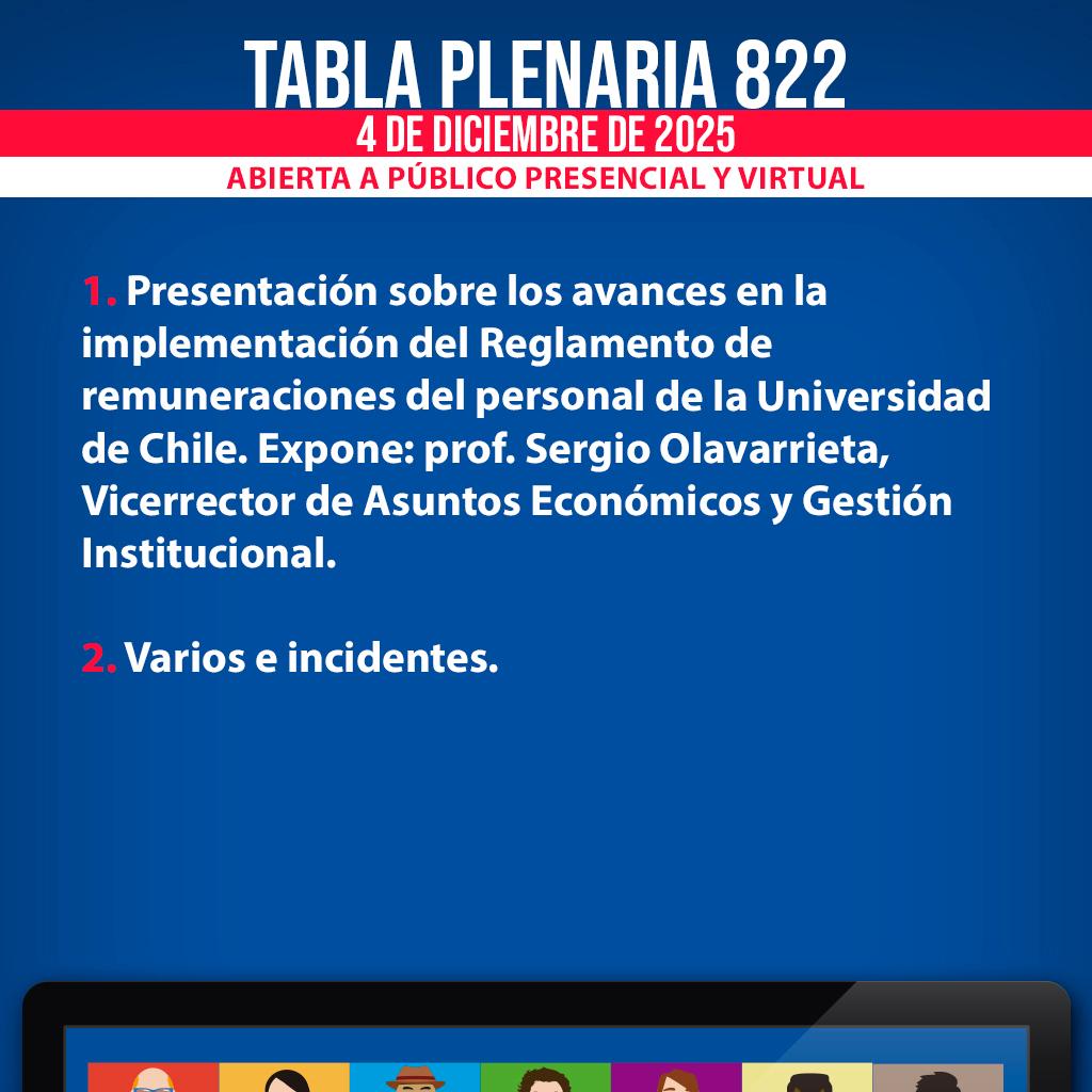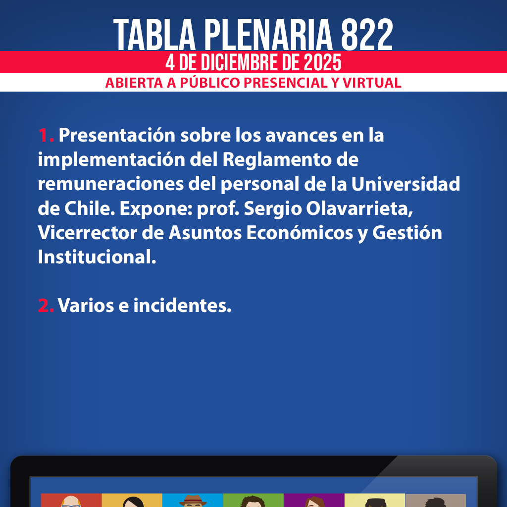 Presentación sobre los avances en la implementación del Reglamento de remuneraciones del personal de la Universidad de Chile. Expone: prof. Sergio Olavarrieta, Vicerrector de Asuntos Económicos y Gestión Institucional (90 minutos).