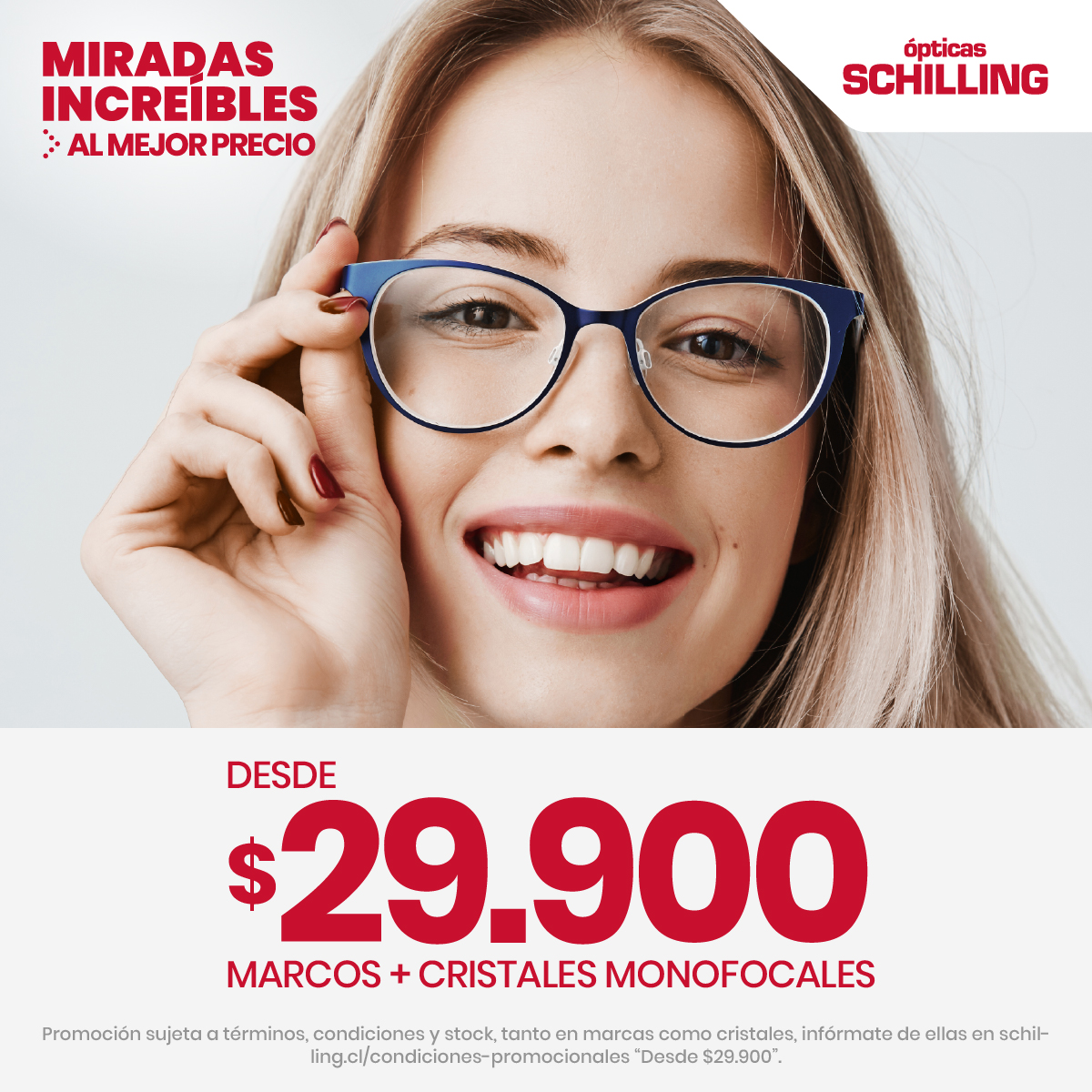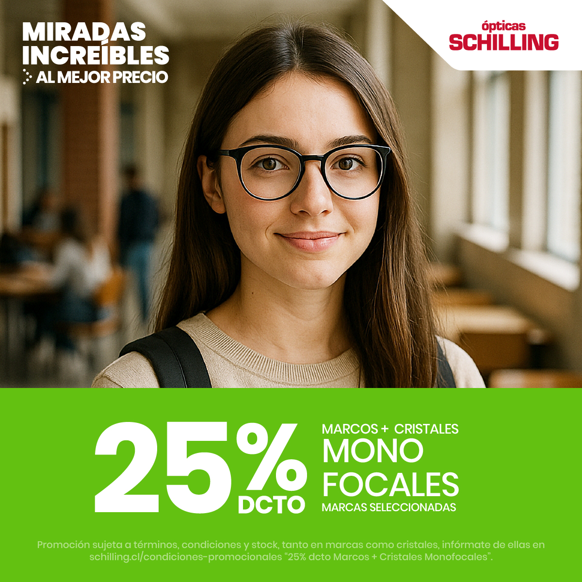 20% armazones y cristales (excepto lentes para presbicia pre graduados), 12% lentes de contacto laboratorio propio y lentes de sol, además de la posibilidad de orden de atención.