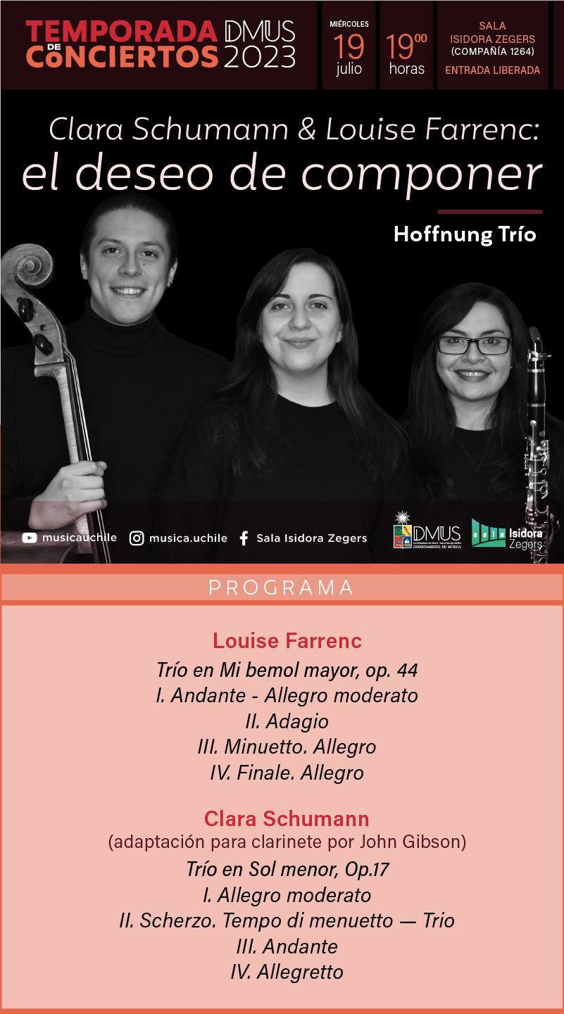 “Poca o ninguna difusión”, así describen los integrantes de Hoffnung Trío el destino que han tenido las obras Trío en Mi bemol mayor, op.44 de la compositora francesa Louise Farrenc y el Trío en Sol menor, op 7 de la autora alemana Clara Schumann. Buscando contribuir a que estas piezas y sus creadoras se conozcan y se escuchen más, es que han decidido traerlas al escenario de la Sala Isidora Zegers.