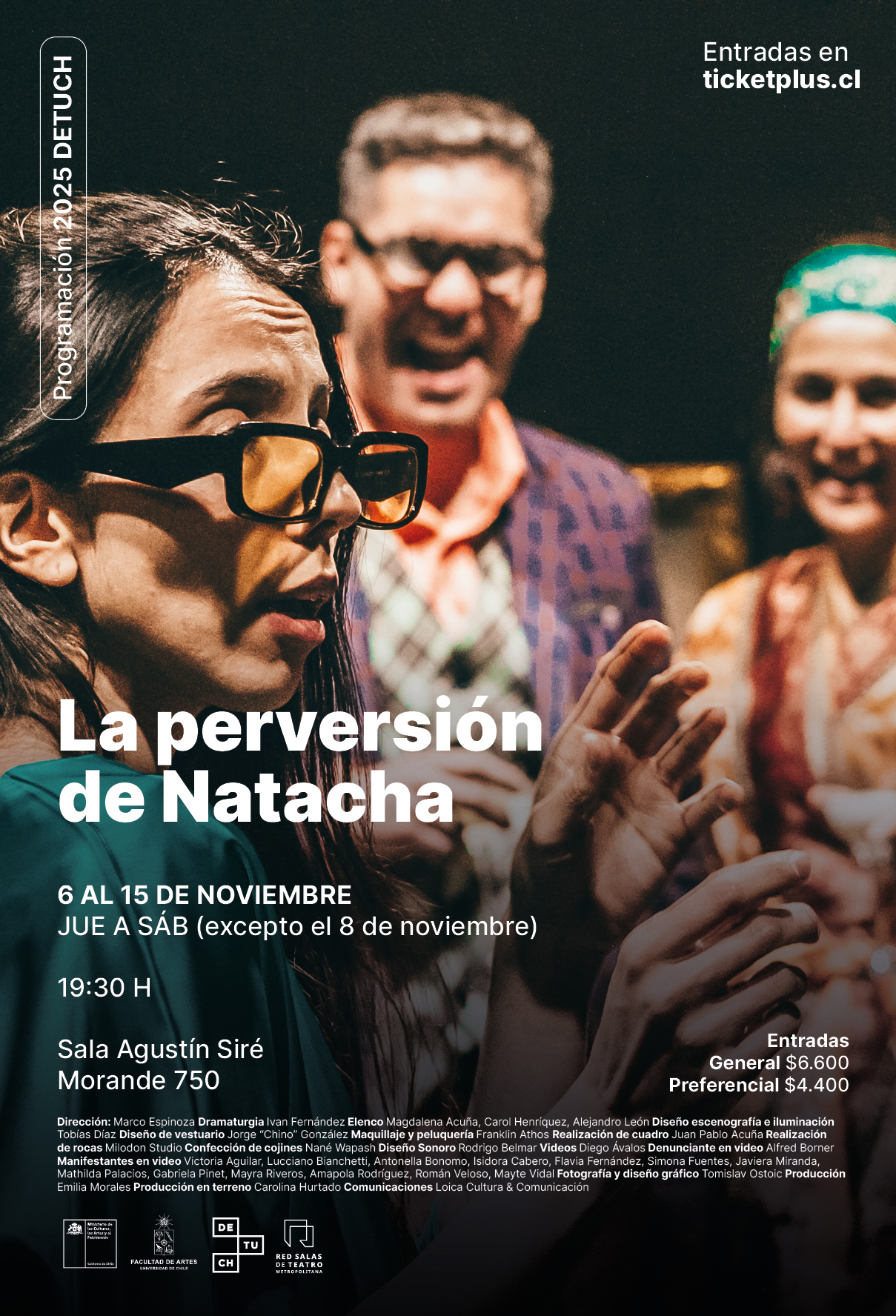 (Morandé 750, Santiago, Chile)Como parte de la Temporada 2025 del Departamento de Teatro de la Facultad de Artes de la Universidad de Chile, se presentará en la Sala Agustín Siré, entre el 7 y el 15 de noviembre, "La perversión de Natacha" de Iván Fernández, dirigida por Marco Espinoza.