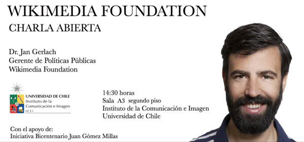 Este lunes 9 de mayo a las 14:30 horas se realizará la charla abierta "Wikipedia y las políticas de acceso al libre conocimiento" dictada por el profesor visitante Dr. Jan Gerlach, gerente de políticas Públicas de Wikimedia Foundation.
