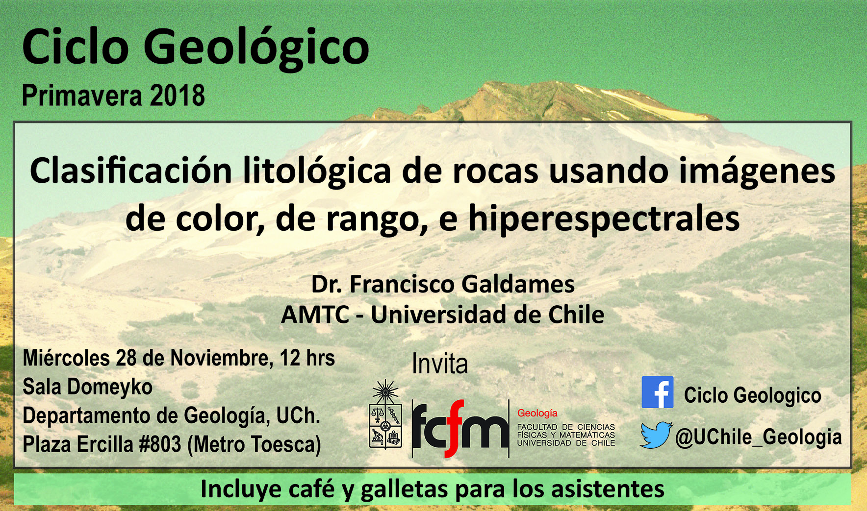 (Plaza Ercilla 803, segundo piso. Santiago, Chile)En una nueva charla del Ciclo Geológico, el Dr. Francisco Galdames del AMTC presentará su tema sobre Clasificación litológica de rocas usando imágenes de color, de rango e hiperespectrales.
