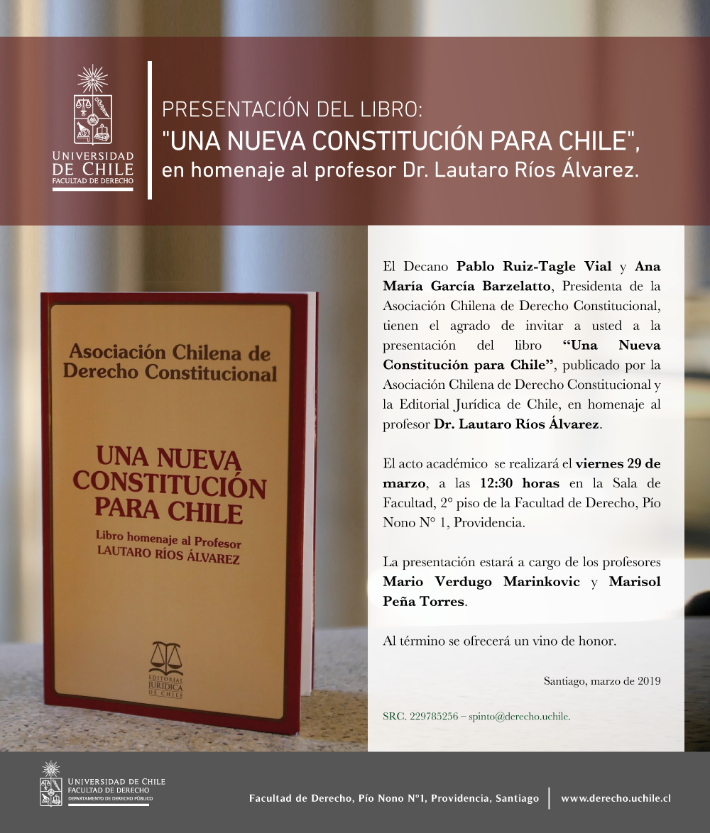El Decano Pablo Ruiz-Tagle y Ana María García, Presidenta de la Asociación Chilena de Derecho Constitucional, tienen el agrado de invitar a la presentación del libro "Una nueva Constitución para Chile", publicado por la Asociación Chilena de Derecho Constitucional y la Editorial Jurídica de Chile, en homenaje al profesor Dr. Lautaro Ríos Álvarez.