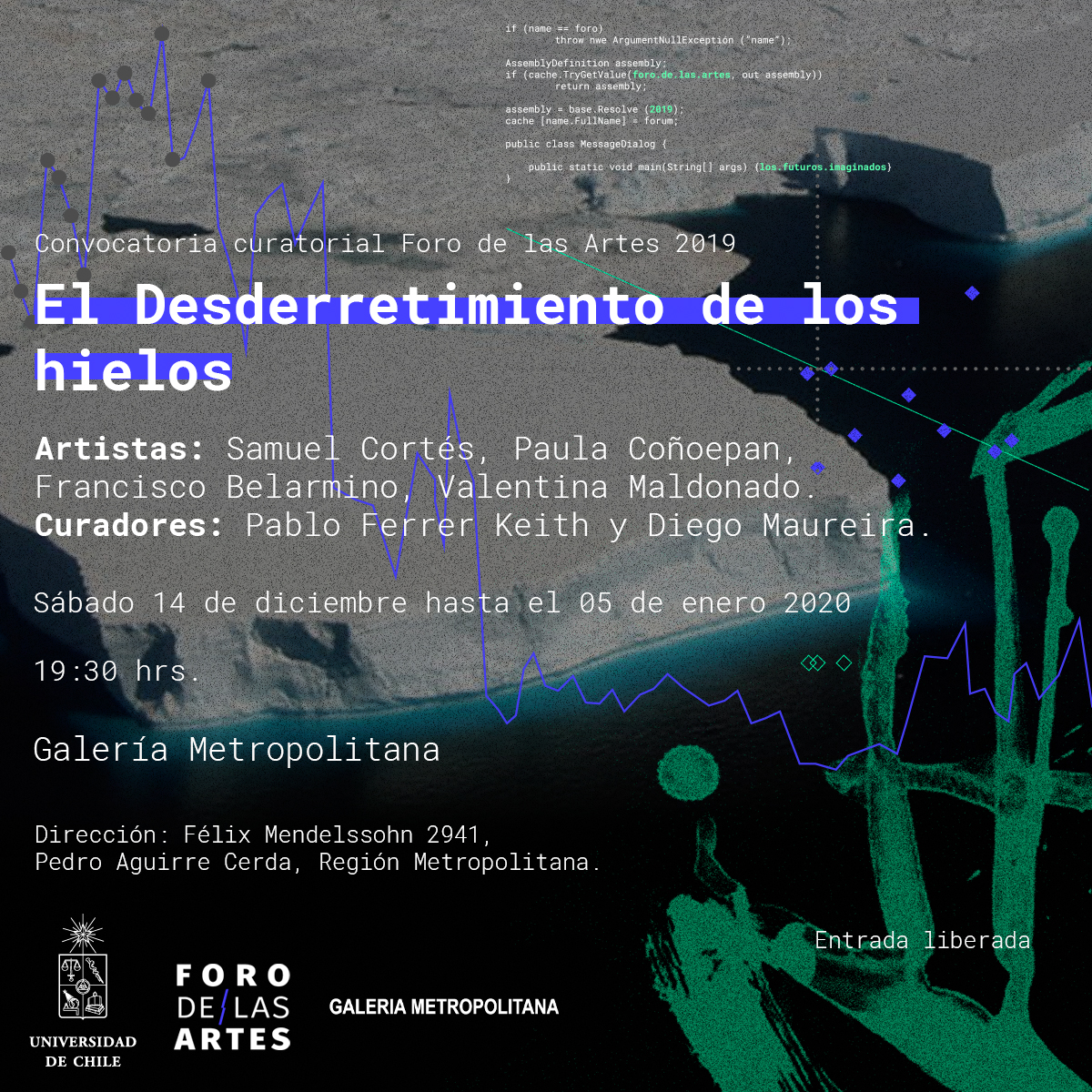 (Félix Mendelssohn 2941, Pedro Aguirre Cerda.)La exposición "El desderretimiento de los hielos" es parte de una imagen o figura literaria relacionada con el tiempo actual. Uno de los problemas transversales a nivel global hoy en día es la crisis medioambiental, cuestión que ha adquirido particular protagonismo luego de la caída del bloque socialista y tras la neoliberalización globalizada del planeta. La era post-industrial de consumo asiste actualmente a un panorama crítico respecto a los ecosistemas que sustentan la vida en el planeta.