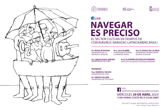 "Navegar es Preciso, el sector cultural en tiempos de Coronavirus (miradas latinoamericanas)", es un seminario que será transmitida vía Facebook Live por el Facebook de la Universidad de Costa Rica que es @UniversidadCostaRica, y se realizará el próximo miércoles 29 de Abril 2020 a las 17 horas en Costa Rica (23:00 GMT), a las 19 HORAS DE Chile.
