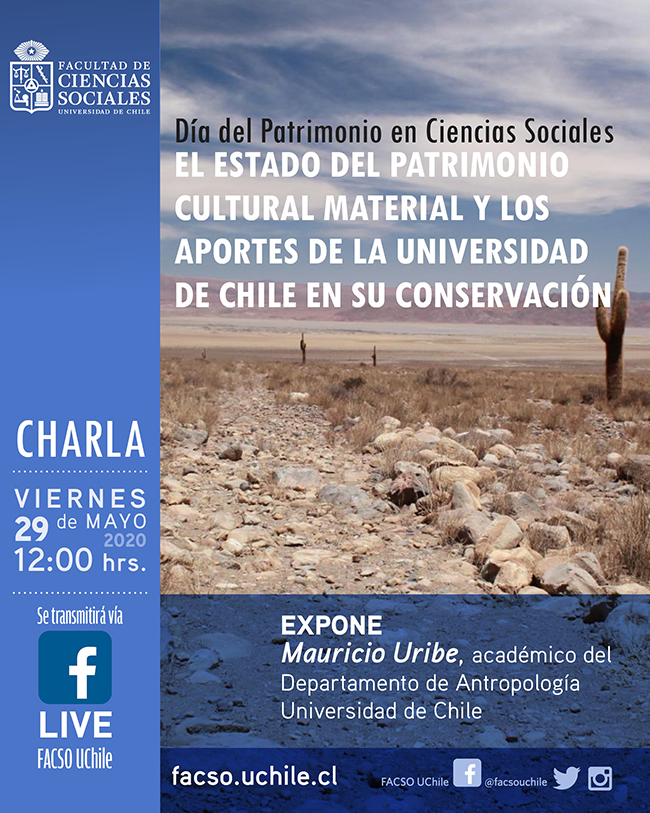 La Facultad de Ciencias Sociales celebrará el Día del Patrimonio con la Charla virtual "El estado del Patrimonio Cultural Material y los aportes de la Universidad de Chile en su conservación", a cargo de Mauricio Uribe, académico del Departamento de Antropología U. de Chile.