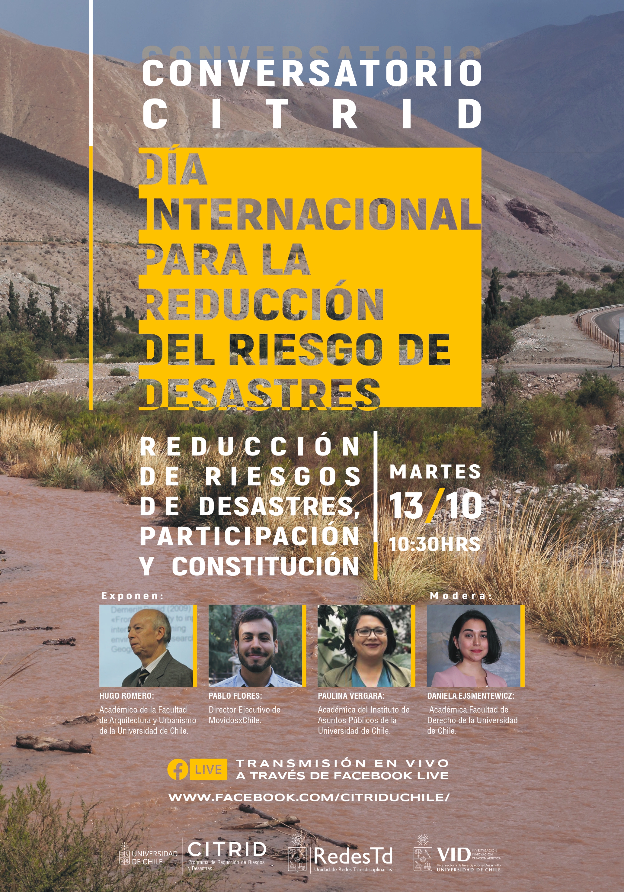En el marco de conmemoración del Día Internacional para la Reducción del Riesgo y Desastres, además del proceso constituyente que está viviendo el país, el Programa Transdisciplinario de Reducción de Riesgos y Desastres (CITRID), coordinado por la Vicerrectoría de Investigación y Desarrollo (VID) de la Universidad de Chile, realizará el Conversatorio “Reducción de riesgos de desastres, participación y constitución”.