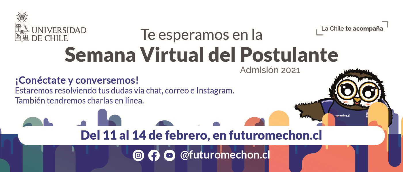 Entre el 11 y 14 de febrero ¡La Chile te acompaña! a través de futuromechon.cl, sus redes sociales y chat permanente, donde integrantes de toda la comunidad universitaria, incluyendo estudiantes de las distintas unidades académicas de la Universidad, responderán las más variadas dudas de las y los postulantes a la educación superior 2021.