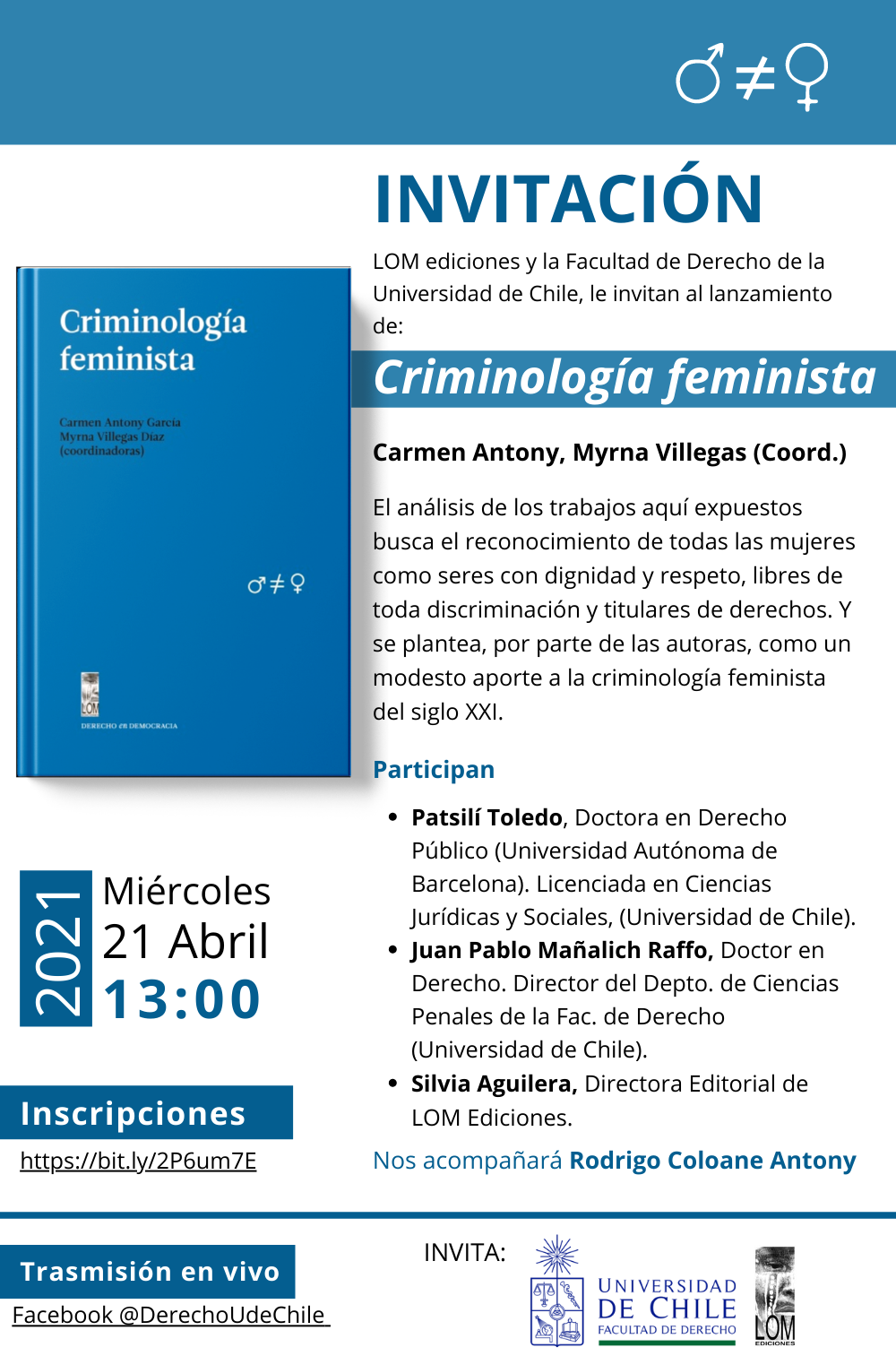(https://bit.ly/2P6um7E)LOM Ediciones y la Facultad de Derecho de la Universidad de Chile invitan al lanzamiento de "Criminología feminista", libro coordinado por Carmen Antony y Myrna Villegas.
