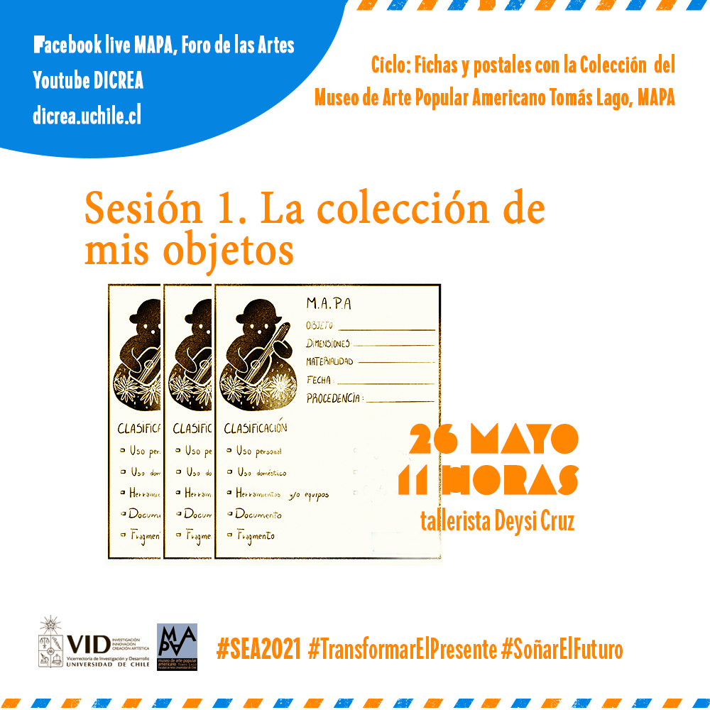 El Ciclo "Fichas y postales con la Colección del Museo de Arte Popular Americano Tomás Lago, MAPA", se enmarca en las actividades que impulsa la Universidad de Chile durante la Semana de la Educación Artística (SEA) 2021, que se extenderá desde el 24 al 28 de mayo.