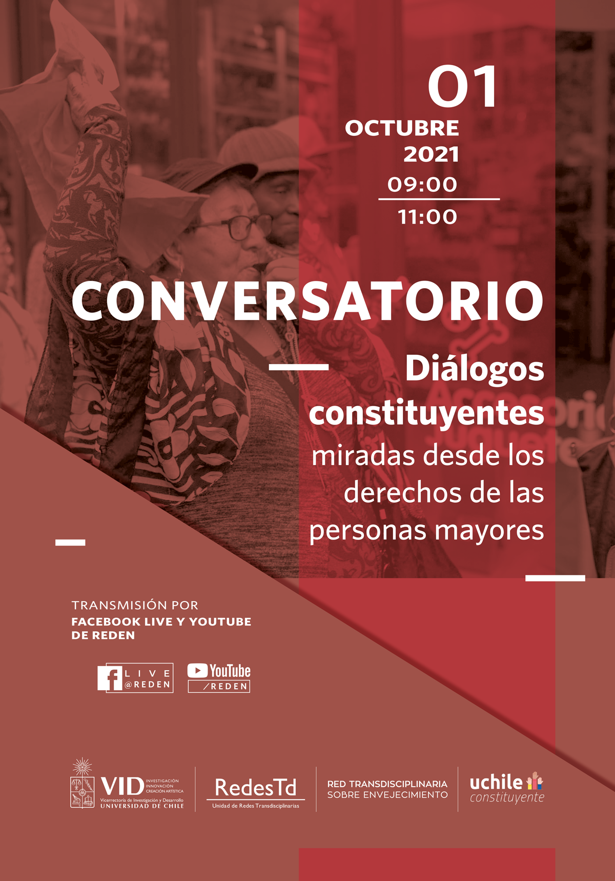 Teniendo esto en cuenta, la Red Transdisciplinaria de Envejecimiento (Reden) realizará de manera telemática el Conversatorio “Diálogos constituyentes: miradas desde los derechos de las personas mayores”, el próximo viernes 01 de octubre. La actividad - que conmemora el día internacional de las personas mayores - tiene por objetivo presentar los resultados de los procesos de discusión anteriormente mencionados, y generar un espacio de diálogo transdisciplinario sobre las principales temáticas a considerar sobre las personas mayores en una Nueva Constitución.