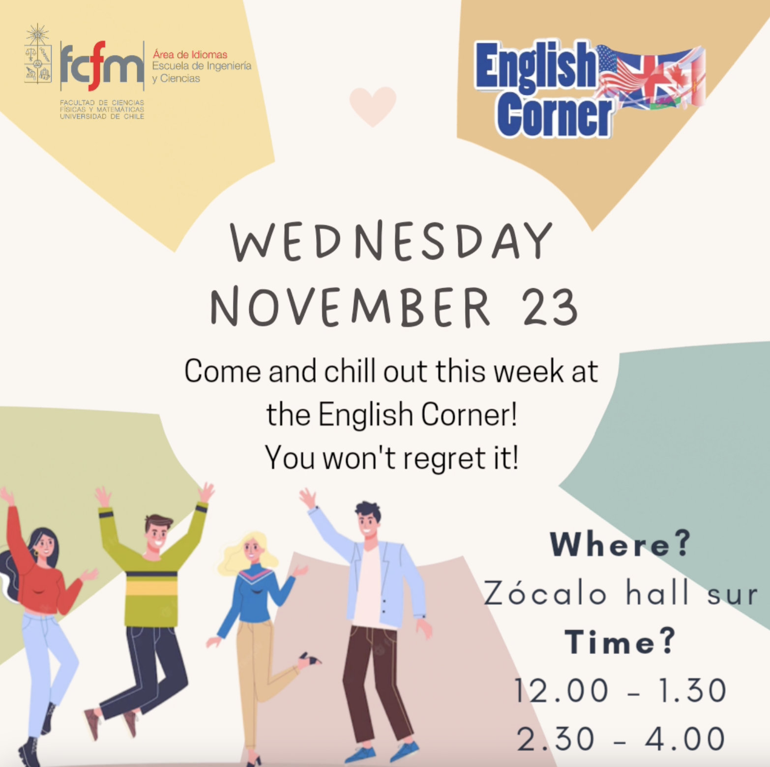 (Beauchef 850, Santiago, Chile)Sesión semanal en que las y los estudiantes encuentran un espacio seguro para conversar sobre diversas temáticas de actualidad (organizadas de acuerdo a sus intereses) y participar en juegos, actividades virtuales y karaokes, entre otros. Cada sesión tiene una duración de tres horas divididas en dos bloques, con dos tutores por cada bloque (estudiantes de la Escuela) a cargo del acompañamiento y monitoreo, guiando las conversaciones y fomentando la interacción entre los y las participantes más allá de su nivel de inglés.
