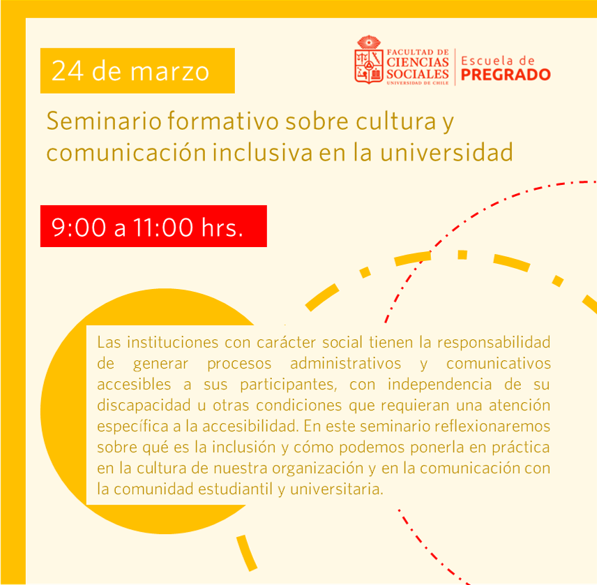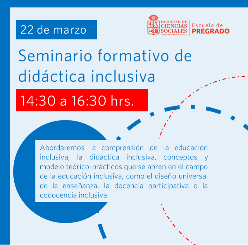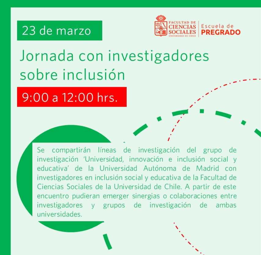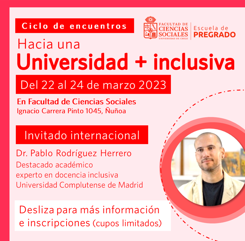 (Avenida Ignacio Carrera Pinto 1045, Ñuñoa.)El Ciclo de Encuentros Hacia una universidad + inclusiva, se realizará del 22 al 24 de Marzo 2023 en distintos horarios y dependencias de la Facultad de Cs. Sociales de la U. de Chile.