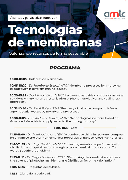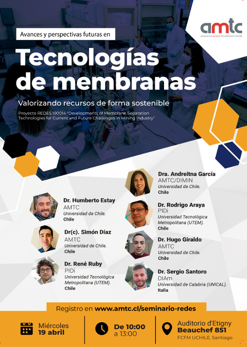 (Beauchef 851, Santiago)Seminario sobre tecnología innovadora para procesos sustentables en diversas industrias, que se realizará en el marco del proyecto REDES 190014 «Developments of Membrane Separation Technologies for Current and Future Challenges in Mining Industry».