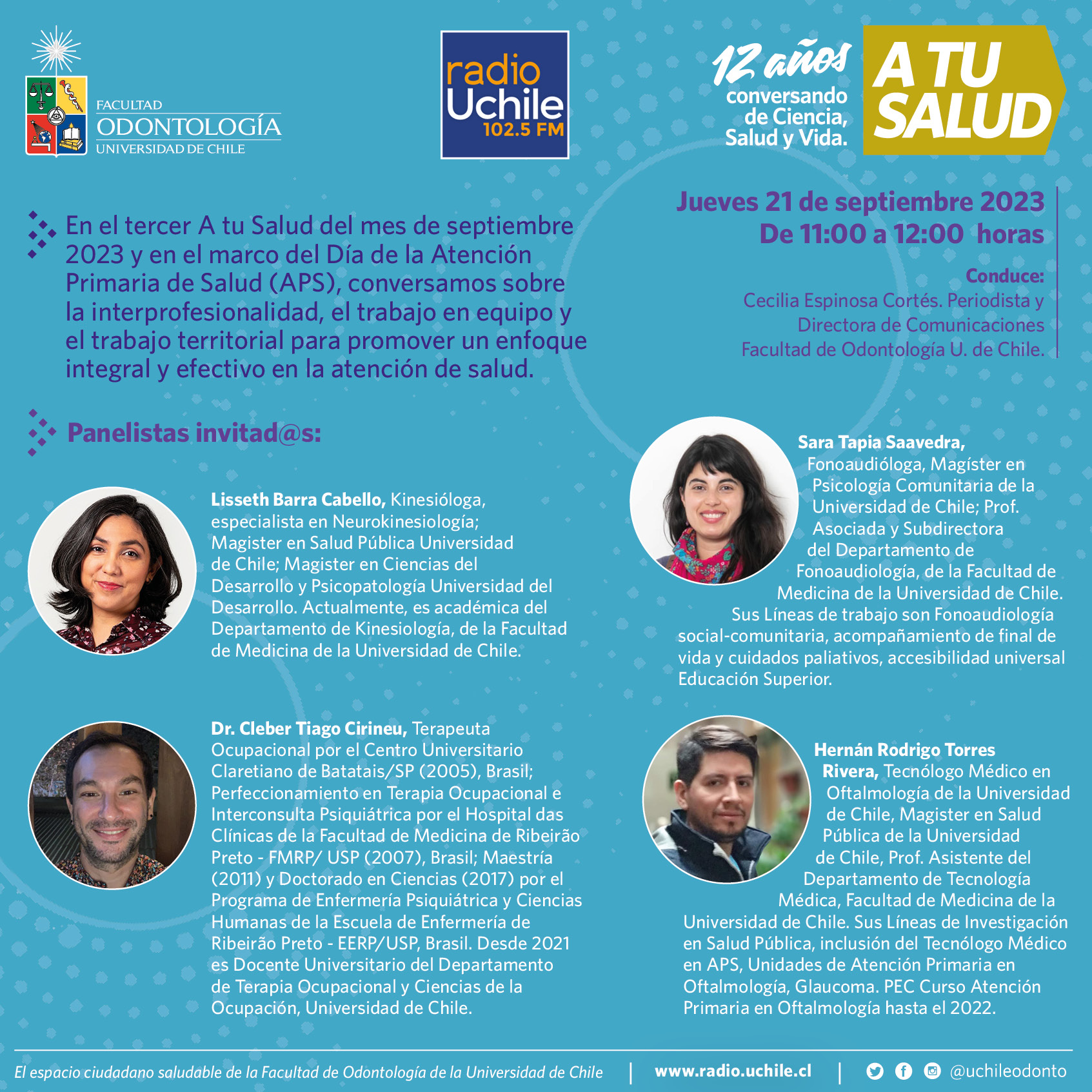 (Miguel Claro 509, Providencia)En el tercer A tu Salud del mes de septiembre de 2023 y en el marco del Día de la Atención Primaria de Salud (APS), conversamos sobre la interprofesionalidad, el trabajo en equipo y el trabajo territorial para promover un enfoque integral y efectivo en la atención de salud.