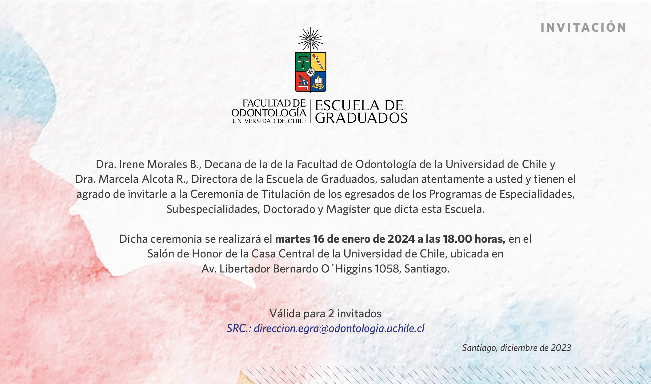 - Dirección Escuela de Graduados, Facultad de Odontología, Universidad de Chile. +562 271651 direccion.egra@odontologia.uchile.cl