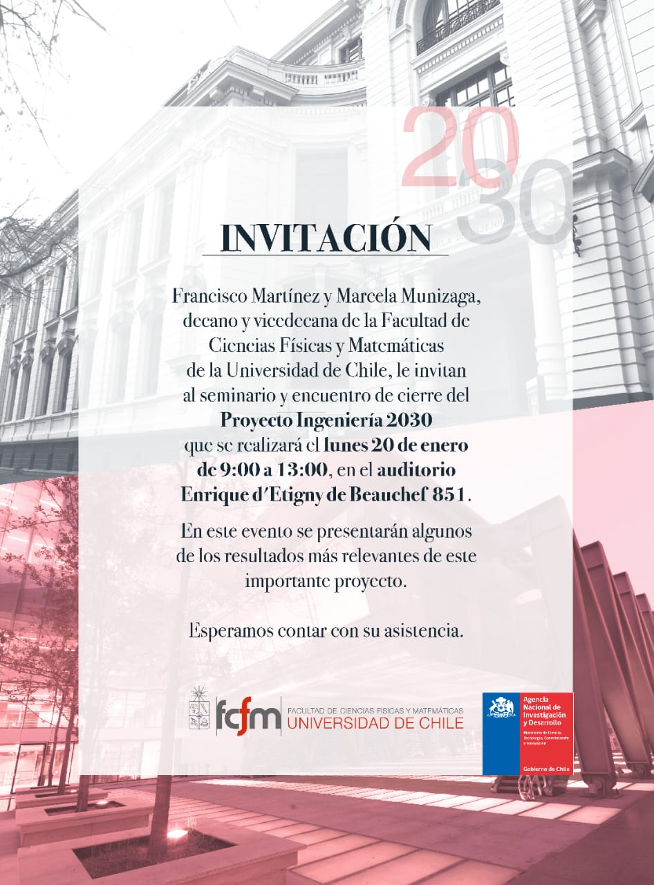 (Beauchef 851, Santiago)El Seminario y encuentro de cierre del Proyecto Ingeniería 2030 se realizará el lunes 20 de enero de 09:00 a 13:00 horas, en el auditorio Enrique d'Etigny de Beauchef 851. Santiago.