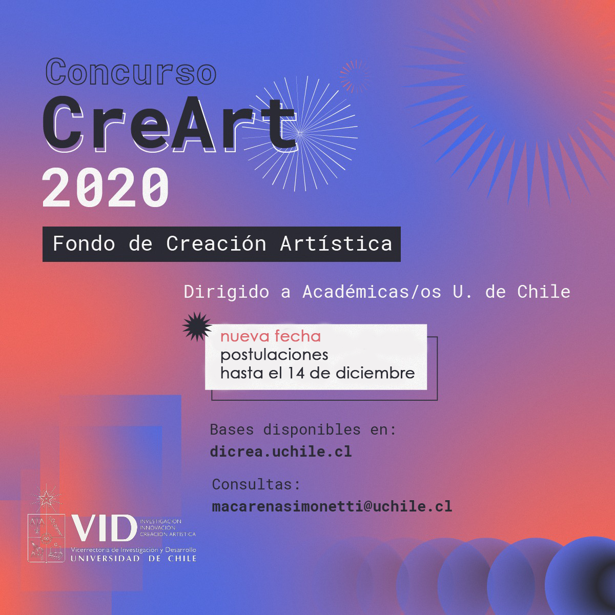 El Concurso CreArt 2020, busca fomentar y difundir la creación artística a nivel de procesos de creación y resultados de obra, desarrollada por académicos y académicas de la Universidad de Chile, en consonancia con la política de la VID por apoyar la productividad en todas las disciplinas que se cultivan en nuestra casa de estudios, incluyendo la creación artística como una actividad fundamental para el desarrollo de nuestra misión institucional.