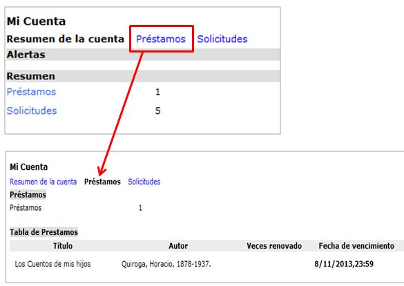 | 1. Préstamos: permite visualizar el número de préstamos cargados a la cuenta y el detalle de estos, incluyendo fecha de devolución. |