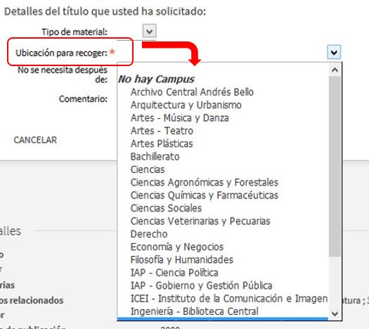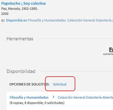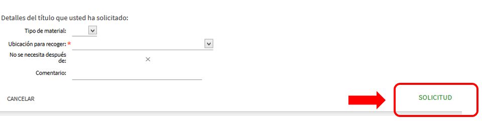 3.- Luego de iniciar sesión, se despliega la opción: Solicitud. ![]() 4. Luego seleccionar biblioteca en Ubicación para recoger, en la cual se retirará el ejemplar, con esa información es suficiente. ![]() 5.- Una vez seleccionada la biblioteca, hacer clic en Solicitud. ![]() 6.- Biblioteca Digital arroja el mensaje cuando la reserva ya esta realizada. ![]()