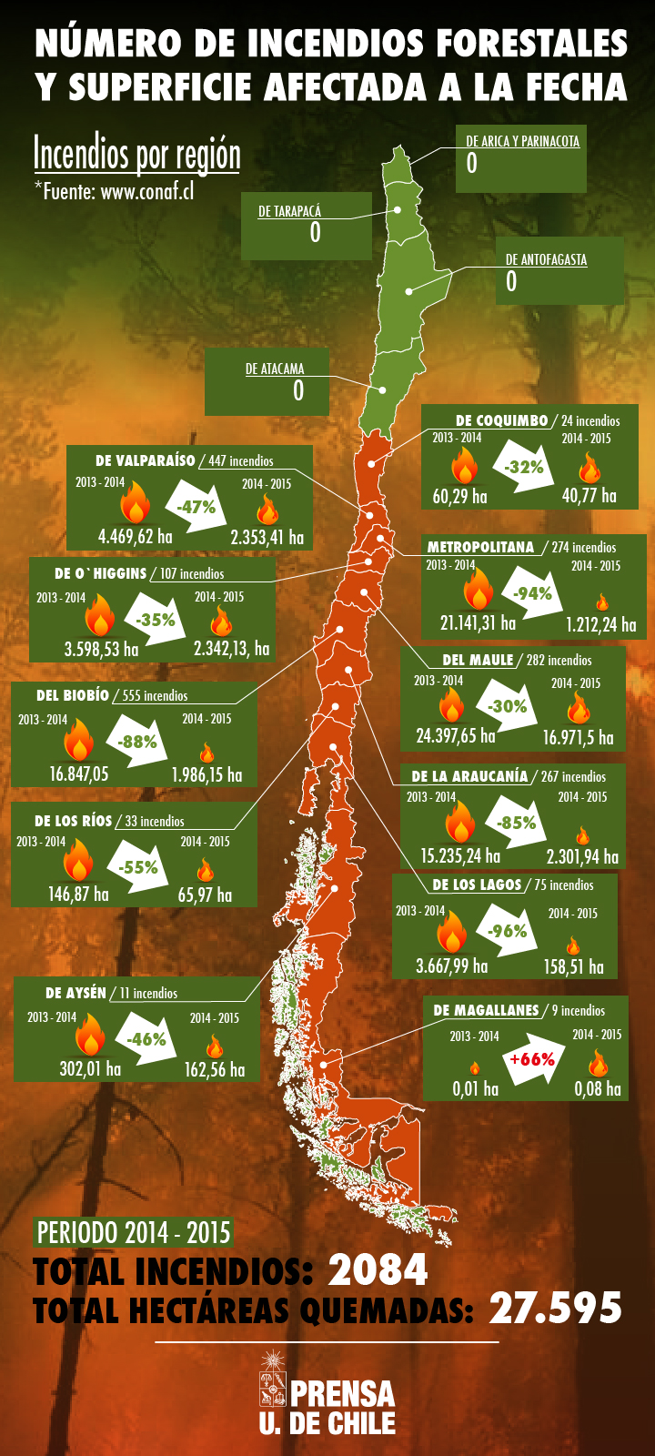 Al 21 de enero del 2015, según concita el sitio web de la CONAF, 2.084 incendios forestales se han registrado en el país, los que han afectado 27.595 hectáreas. Si bien estos indicadores son inferiores al periodo anterior, el gerente de protección contra Incendios Forestales de la CONAF, Sergio Mendoza advierte que “estas cifras podrían ser muy prematuras para dar cuenta de lo que sucederá esta temporada. Avizoramos de acuerdo a lo que son las tendencias climáticas que va a ser una temporada más tardía pero no menos intensa. Febrero, marzo y abril van a ser meses más secos, más calurosos y eso nos lleva a que tenemos que estar preparados para enfrentar futuras situaciones”.
