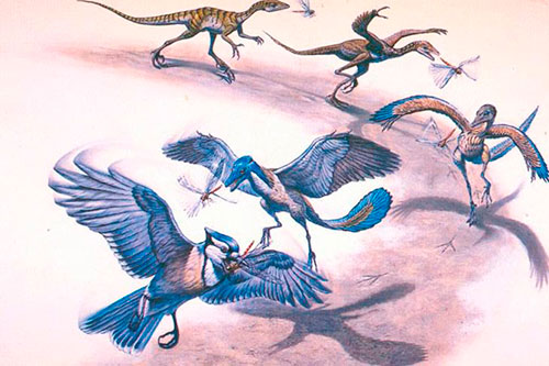 Aunque lo que causa más sorpresa es que las aves no vendrían de pequeñas especies jurásicas, sino de grandes carnívoros bípedos (también llamados terópodos) como, por ejemplo, los tiranosaurios o los velociraptors. “Efectivamente, es uno de los casos más dramáticos de reducción de tamaño en la evolución”, dice el académico de la U. de Chile.
