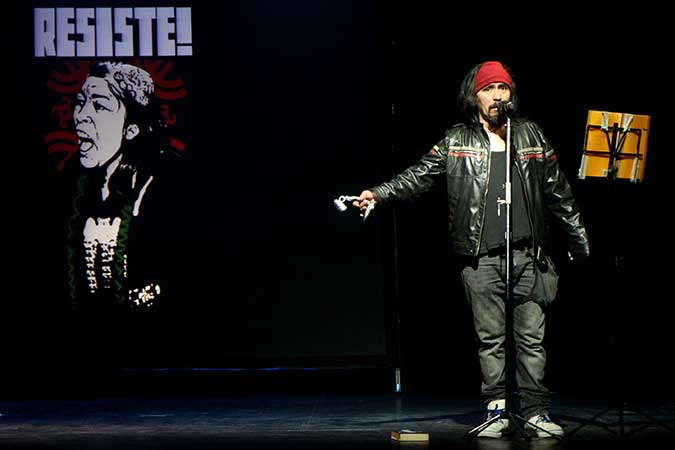 El creador del concepto mapurbe, término que unifica lo mapuche con lo urbano, y que según la académica Soledad Falabella, “se ha acunado al desarrollo del patrimonio cultural mapuche contemporáneo”, realizó lo que ha juicio de la docente es una performance poética, donde resalta el problema que el colonialismo ha provocado con los pueblos originarios en el mundo.