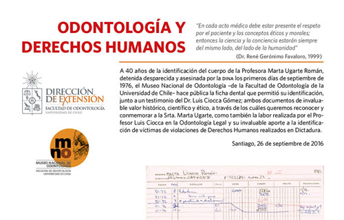A través de este artículo, he querido rendir un homenaje a Marta Ugarte Román, paciente mía, una mujer buena sacrificada por sus ideas, cuyo martirio me estimuló para poner la ciencia odontológica proyectada al servicio social, al respeto por los derechos humanos, a esclarecer la identidad de las víctimas de crímenes atroces y con ello contribuir de manera importante a romper la impunidad. Con Ciencia, con Etica, con Humanidad.
