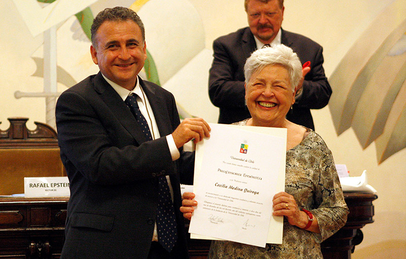 La comunidad universitaria en pleno reconoció el aporte académico de la profesora Cecilia Medina Quiroga, quien se convirtió en la primera mujer de la Facultad de Derecho en ser reconocida como Profesora Emérita. La ceremonia de investidura se efectuó en el marco del inicio de la VII Conferencia Internacional de Educación en Derechos Humanos, evento cuyas versiones anteriores se realizaron en Australia, Sudáfrica, Polonia, Taiwán y Estados Unidos, y que este 2016 por primera vez se efectúa en América Latina.