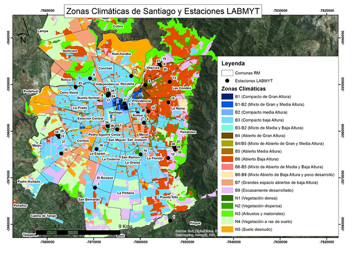 El concepto de Zona Climática Local corresponde a un área de la ciudad que en virtud de sus usos del suelo, tipos de construcciones y coberturas vegetales, debe producir condiciones climáticas distintas a sus zonas vecinas. Tal como se puede apreciar en la figura, existe una gran cantidad de zonas climáticas locales en función del tamaño y complejidad de la ciudad, pero pueden reconocerse zonas en virtud de sus rasgos socio-ecológicos predominantes. De allí que en el caso de las ciudades se hable también de socio-climas o climas socialmente construidos en función de los niveles socioeconómicos de sus habitantes. Las tablas ilustran sobre la localización de los puestos de mediciones que han estado registrando las temperaturas, contando con la valiosa cooperación de los vecinos que los tienen instalados en sus patios o antejardines.