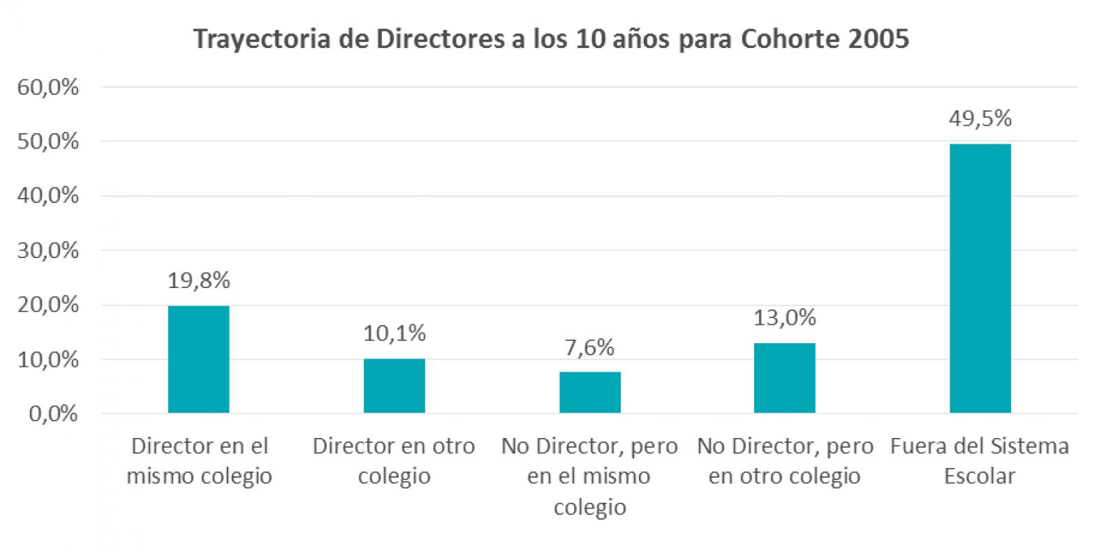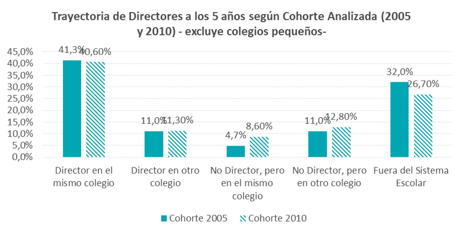 Por otra parte, la mitad de los directores que dejan su cargo en el colegio se retiran del sistema escolar, perdiéndose su experiencia y su potencial capacidad de apoyar al mejoramiento de otros colegios. Sin embargo, en la cohorte del 2010 dicha situación se reduce, puesto que es más probable que los directores que no continúan en el mismo colegio lo hagan como director en otro colegio o en otro cargo docente en el mismo establecimiento o en otro.